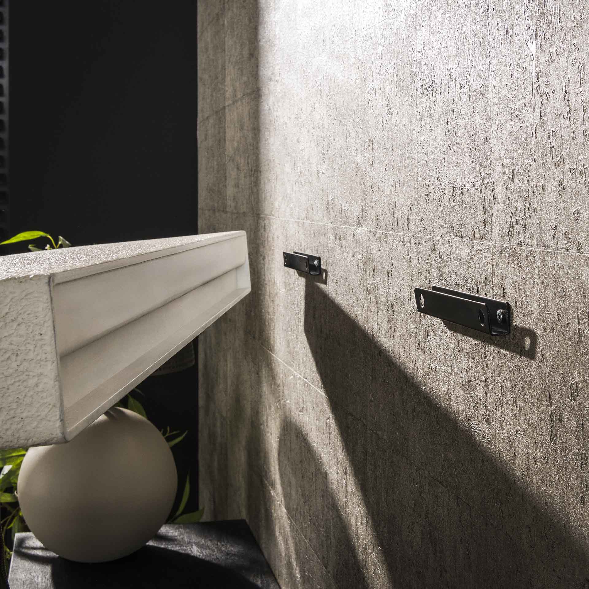 De wandplank 'Stone' wordt bevestigd aan de wand met behulp van twee metalen strips, waardoor hij stevig en strak tegen de muur blijft zitten. Deze constructie zorgt voor een minimalistische en eigentijdse uitstraling, terwijl het ook zorgt voor een stabiele en veilige bevestiging.