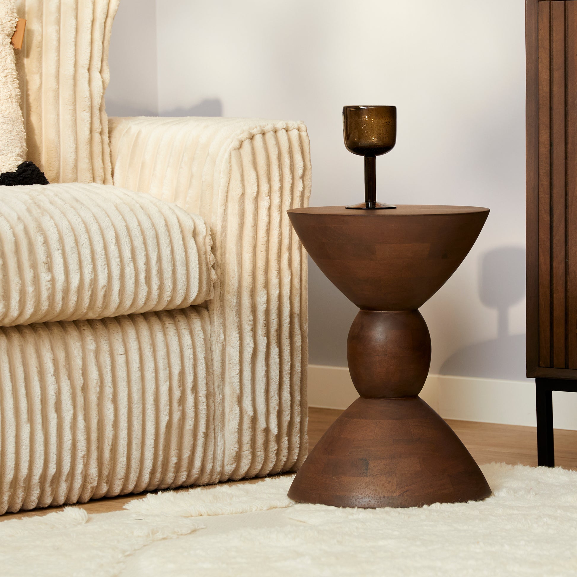 Maak kennis met de Bijzettafel Ron. Deze ronde bijzettafel is gemaakt van mangohout en heeft een uniek design. Deze bijzettafel is een opvallend element in de ruimte. Deze bruine bijzettafel kan perfect naast je bank staan om daar je heerlijke kop koffie, kop thee of koud biertje neer te zetten tijdens het kijken van je favoriete serie of sportwedstrijd.