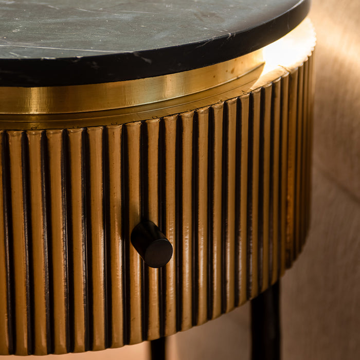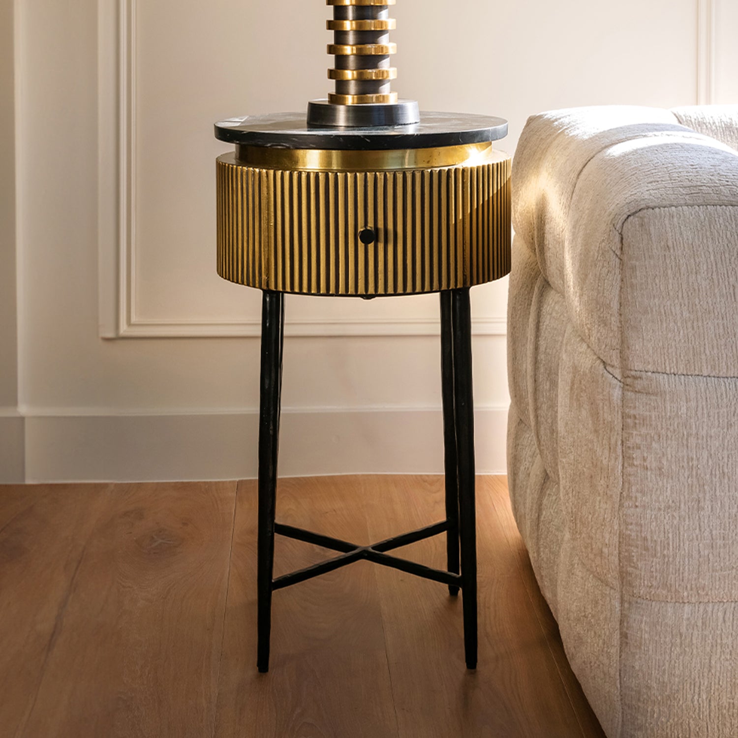Voeg een vleugje glamour toe aan je woonruimte met de Bijzettafel Ironville. Met zijn elegant gouden frame, verfijnd zwart marmeren blad en zwarte poten straalt deze bijzettafel klasse en verfijning uit in elke kamer.