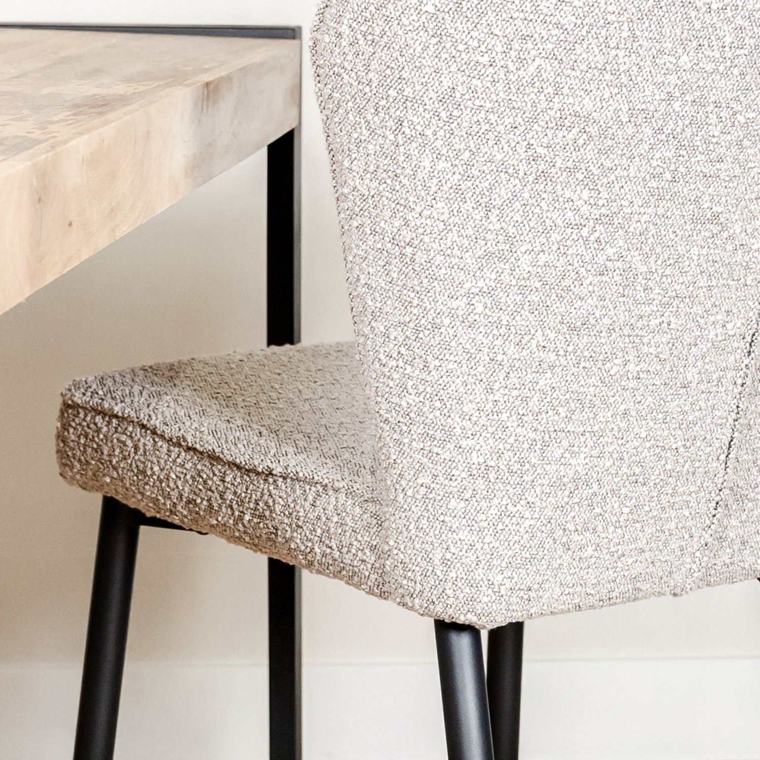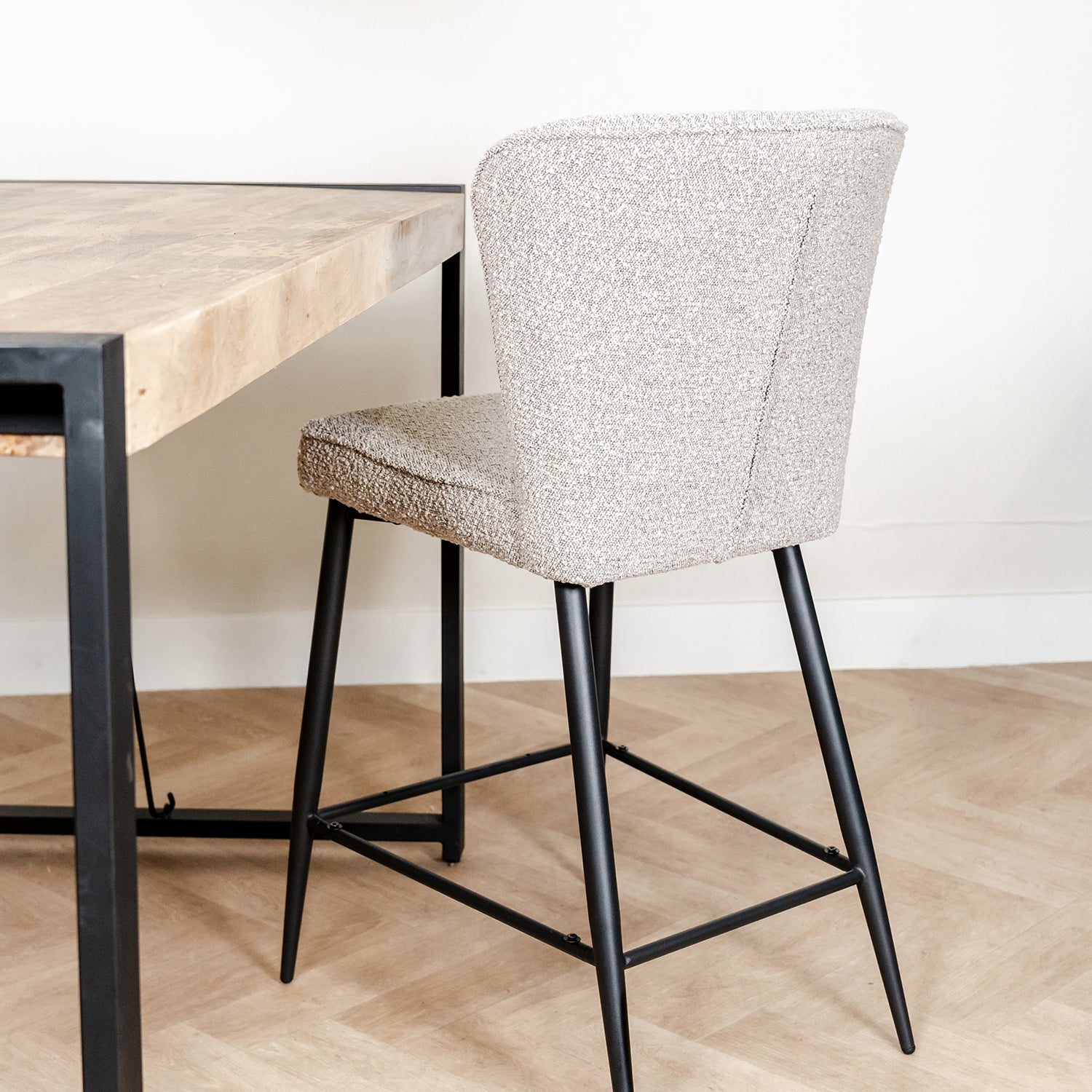 Barstoel Fermo is bekleed met de zachte stof bouclé en is verkrijgbaar in verschillende fijne kleuren. De barstoel is enorm comfortabel door de extra vulling in de rugleuning en de zitting. De bouclé stof geeft een zachte, aangename zitervaring en voegt een vleugje luxe toe aan jouw interieur. Het onderstel is gemaakt van metaal met een stoere zwarte afwerking.
