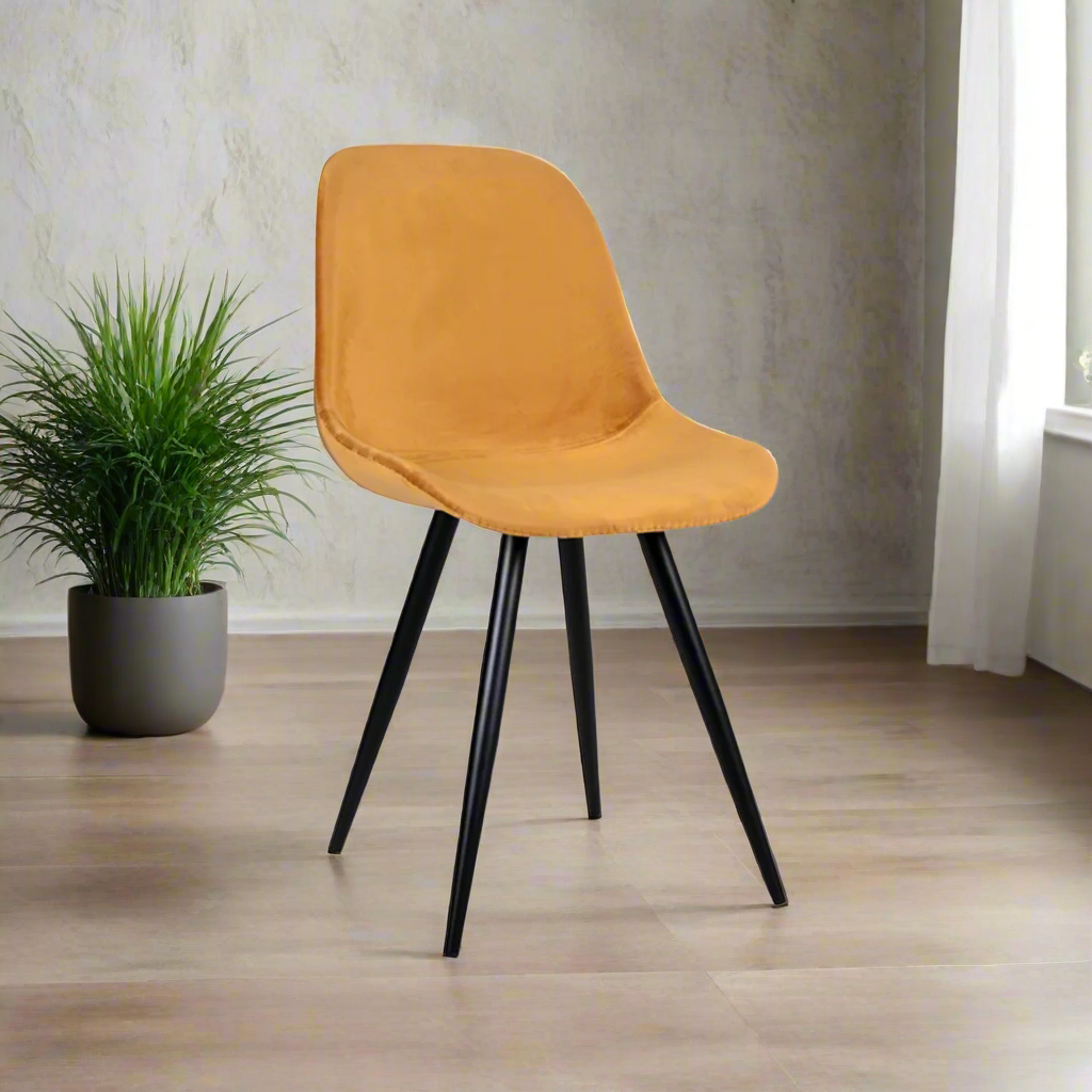De Eetkamerstoel Capri in geel velvet is een echte blikvanger in jouw interieur. De combinatie van luxe velvet stof en het slanke metalen onderstel zorgt voor een stijlvolle en moderne uitstraling. Het zachte schuimzitting biedt optimaal comfort, waardoor lange diners of gezellige avonden aan tafel een plezier worden. De warme okergele tint geeft een speelse touch en past perfect binnen diverse interieurstijlen, van modern tot retro.
