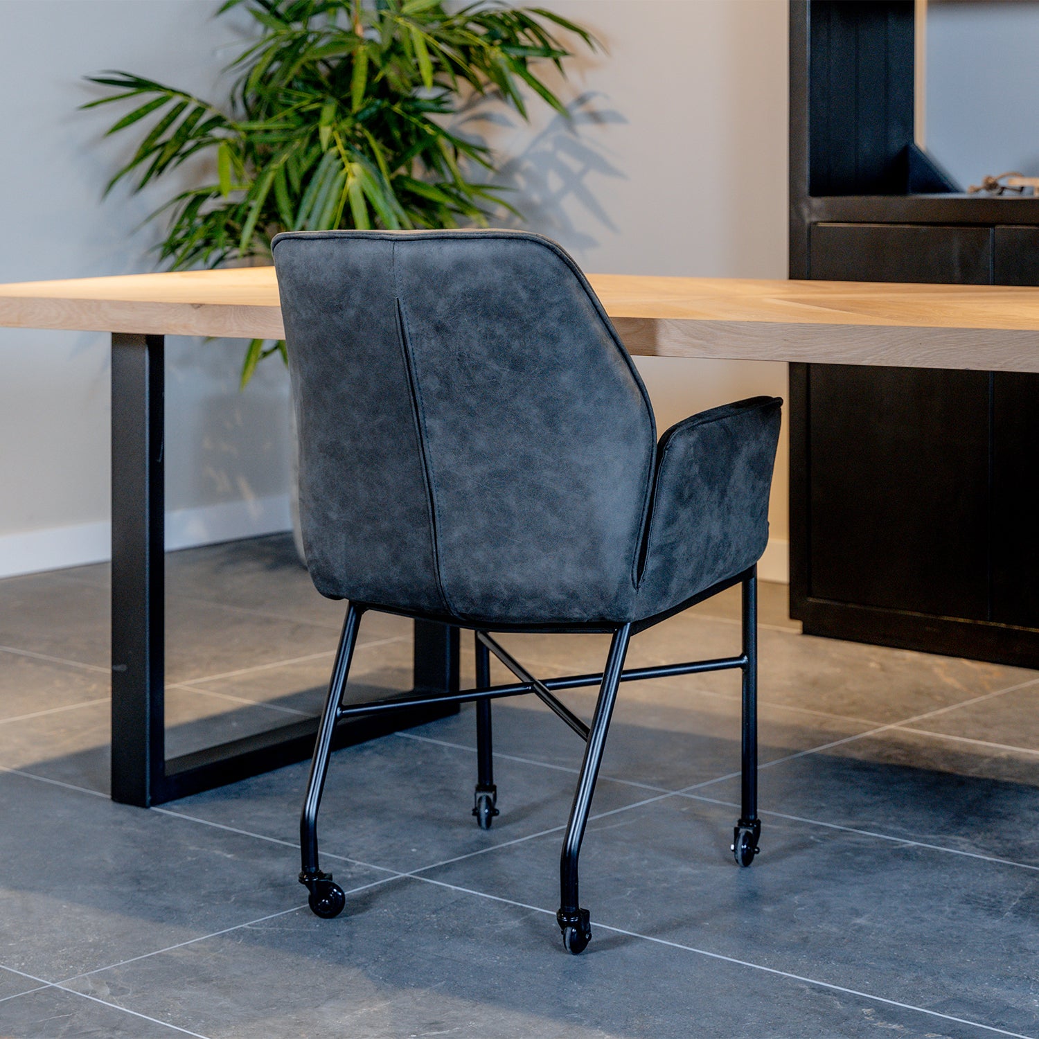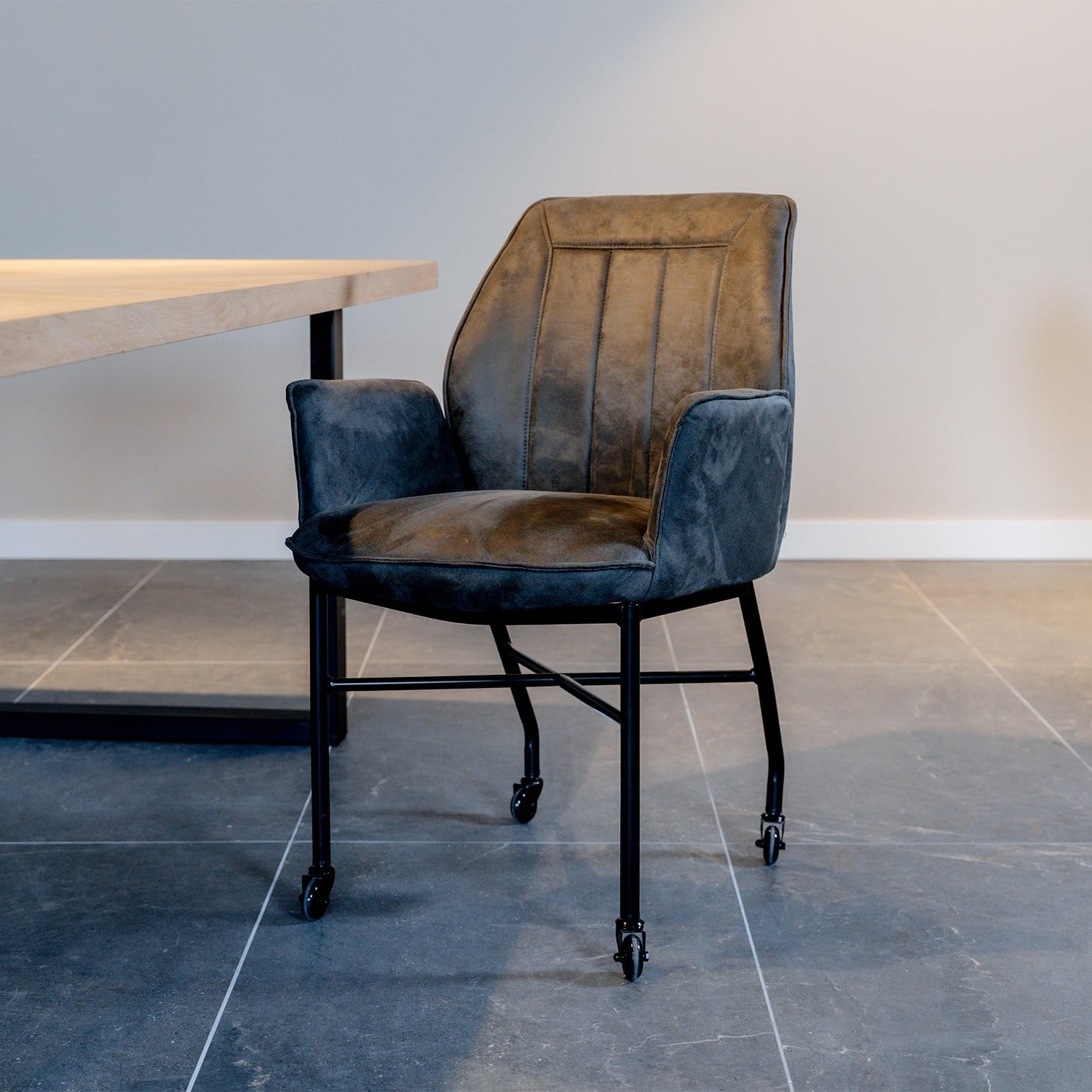 De wieltjes onder de stoel maken het eenvoudig om in en uit te schuiven aan de eettafel, wat niet alleen handig is voor maaltijden, maar ook voor vergaderingen of gezellig samenzijn. De stevige constructie en de robuuste rugleuning zorgen voor duurzaamheid en comfort, zodat je urenlang kunt genieten van zitten zonder enige zorgen. De armleuning voegt een vleugje elegantie toe aan het ontwerp en fijne ondersteuning, wat het tot de perfecte keuze maakt voor ontspannen en dineren. Deze eetkamerstoel op wieltjes biedt het beste van beide werelden: praktisch gemak en solide comfort, waardoor je eetkamer niet alleen functioneel maar ook stijlvol is.