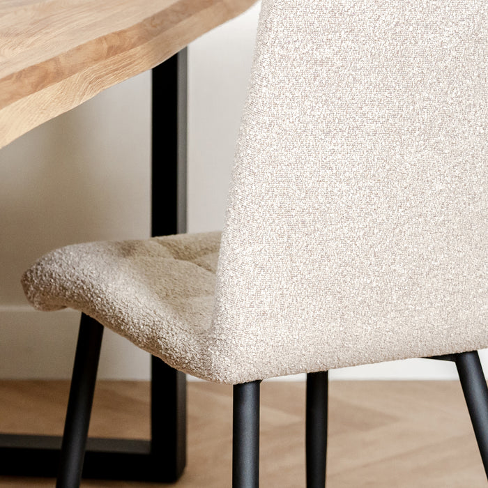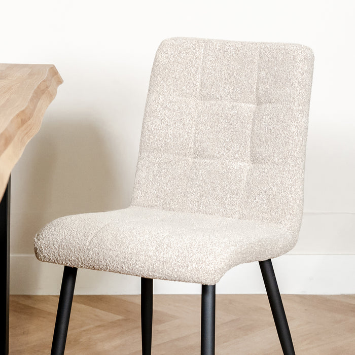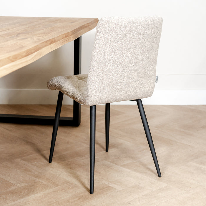 Door zijn vormen en materialen past Sam in ieder trendy interieur. Heb je nou een Modern interieur, Scandinavisch interieur of Industrieel interieur? Eetkamerstoel Sam in de stof Bouclé is mega geschikt om mee te variëren en combineren. Denk aan een fijne stoel voor aan jouw bureau of kaptafel. Natuurlijk is deze betaalbare eetkamerstoel ook leuk als set aan de eetkamertafel te plaatsen. Door zijn lichte gewicht en compacte formaat is Sam ook de ideale stoel voor aan een kleine eettafel. Voor ieder wat wils.