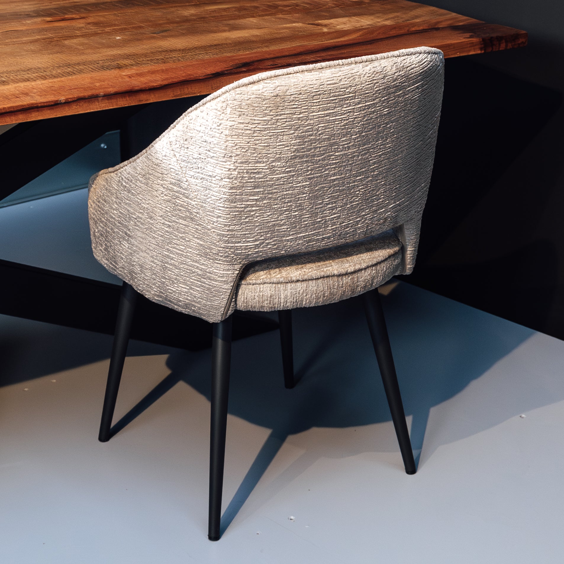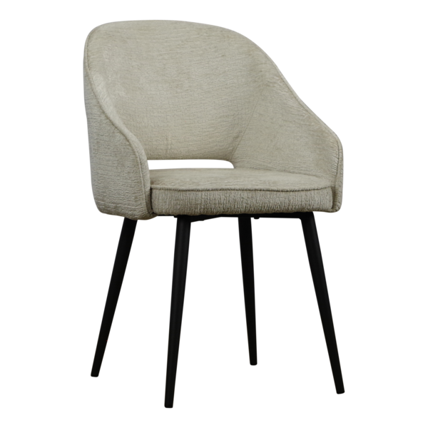 De bekleding van zachte stof geeft de eetkamerstoel Merel een luxe uitstraling en is duurzaam genoeg voor dagelijks gebruik. Kies voor de warme tint van taupe, de luchtige uitstraling van beige, of de moderne elegantie van grijs om jouw interieur een frisse en stijlvolle look te geven.