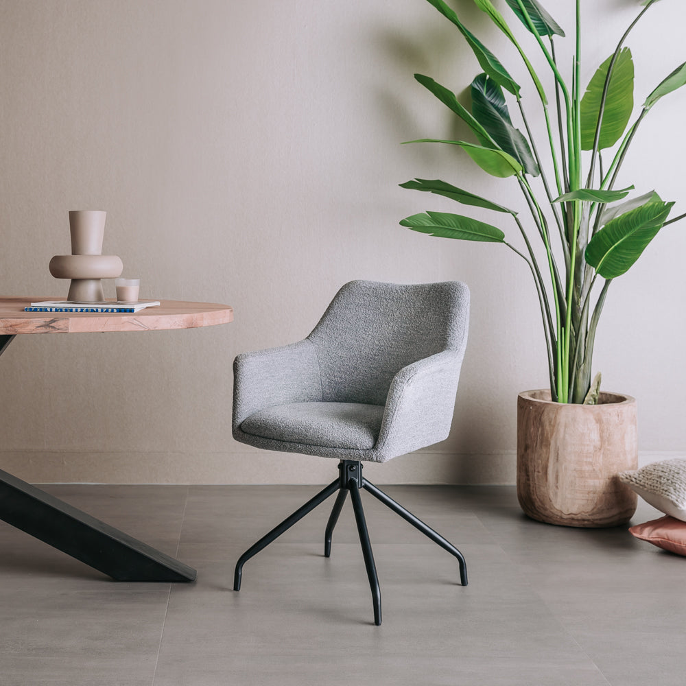 Draaibare Bouclé eetkamerstoel Ortana is uitgerust met een handig draaiframe waardoor je gemakkelijk in en uit de stoel kan stappen.