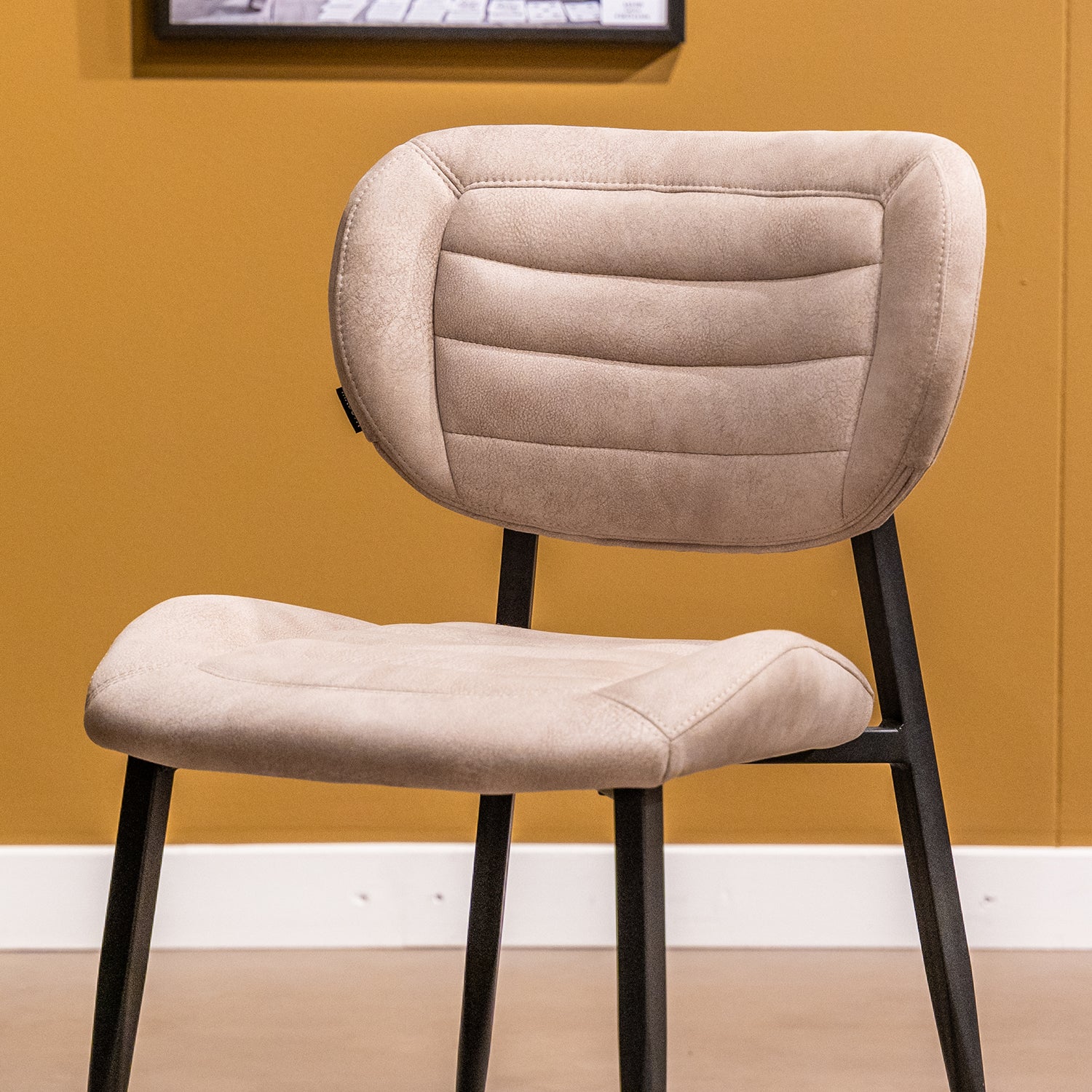 Het zwarte metalen frame bestaat uit 4 subtiele poten en loopt door tot de rugleuning. Dit biedt extra stevigheid. Bij de rugleuning kan je het frame ook vast pakken om de stoel makkelijk te verschuiven.