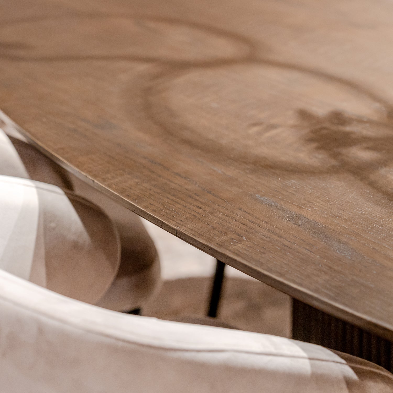 De eikenhouten poot heeft een prachtige ribbel afwerking, wat niet alleen voor stabiliteit zorgt, maar ook een eigentijds contrast creëert met het warme houten blad.
