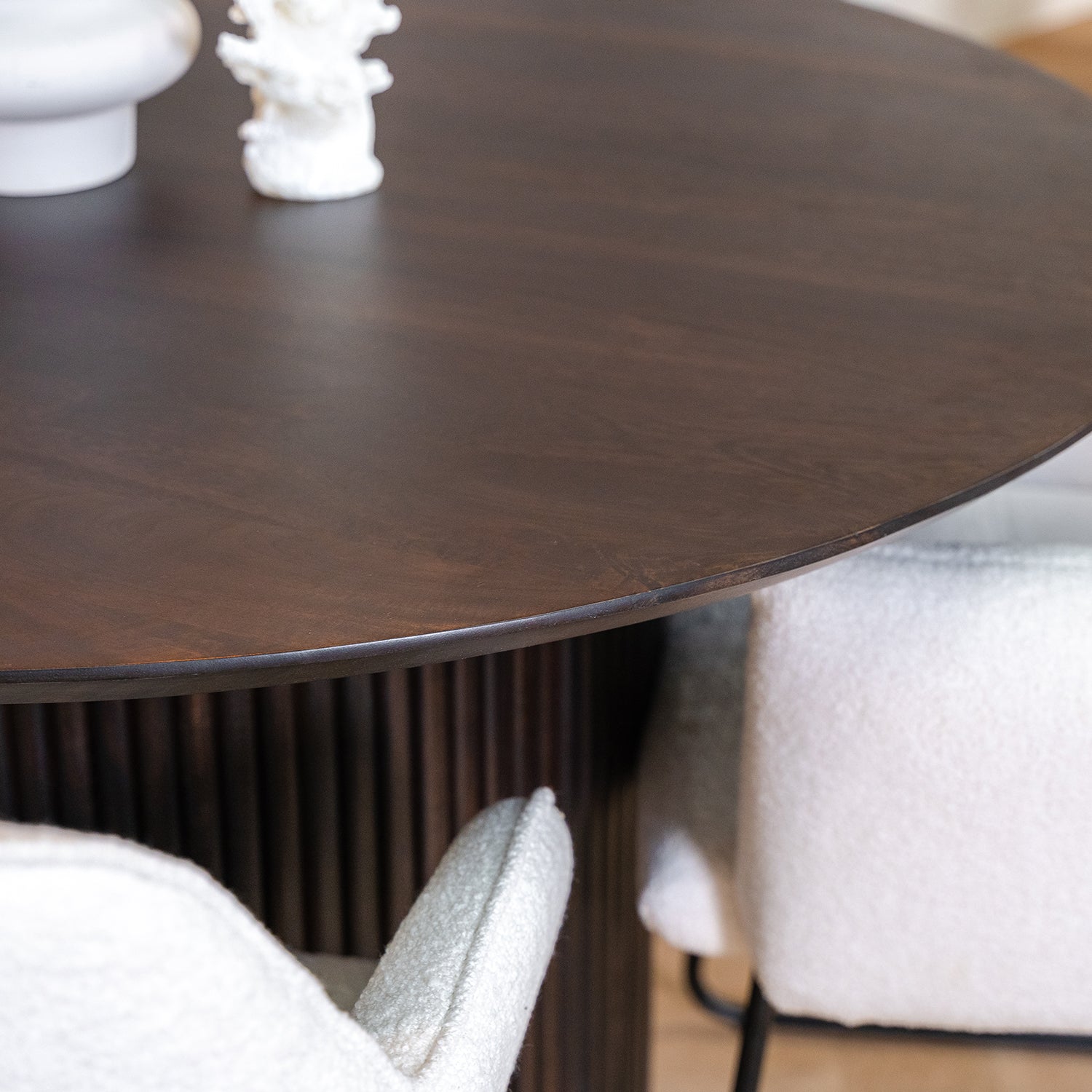 Maak kennis met de Eettafel Congo in Walnoot Mangohout. Deze ronde eettafel is een prachtig en unieke meubelstuk gemaakt van Mangohout. De onderkant is vervaardigd uit houten latten wat een bijzondere en unieke uitstraling geeft. Het blad is geconstrueerd uit verschillende houten planken, waaronder elke eetkamertafel een eigen unieke look heeft. Deze tafel geeft net dat stukje extra aan je woonkamer.