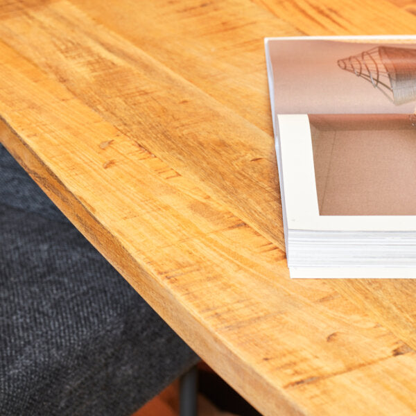 De eettafel Elegance is geconstrueerd uit mangohout en metaal. De mangohouten componenten zijn voorzien van een blanke laklaag en de metalen matrixpoot heeft een zwarte laklaag. De vorm van de eettafel noemen we 'Deens Ovaal'. Dit is een nieuw Scandinavisch design. De tafel is op een elegante wijze op de hoeken rond afgewerkt, dit is erg chique. Daarnaast is het ook nog erg praktisch, want het bespaard veel ruimte! Wil jij met dé woontrends van 2023? Dan is deze tafel zeker iets voor jou!