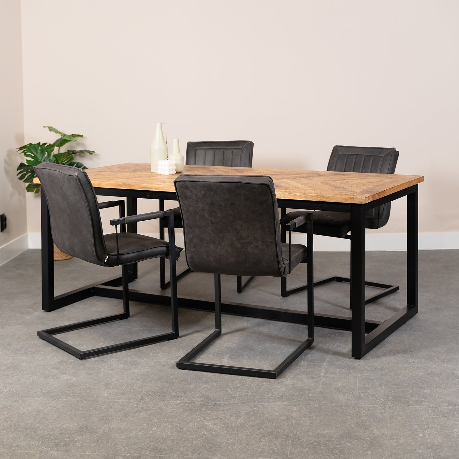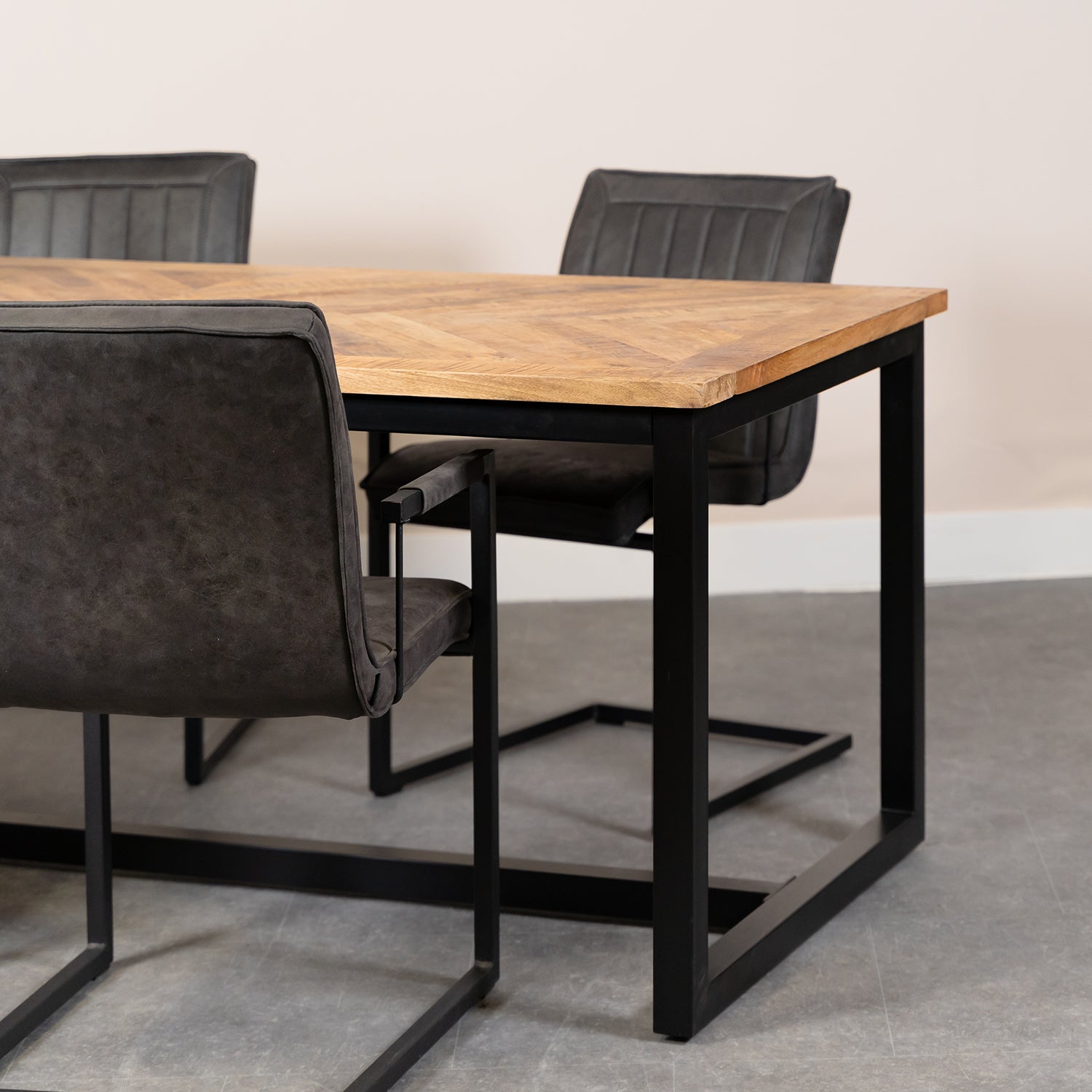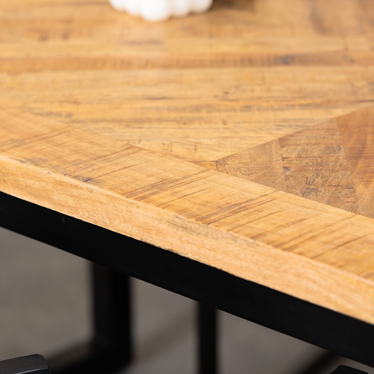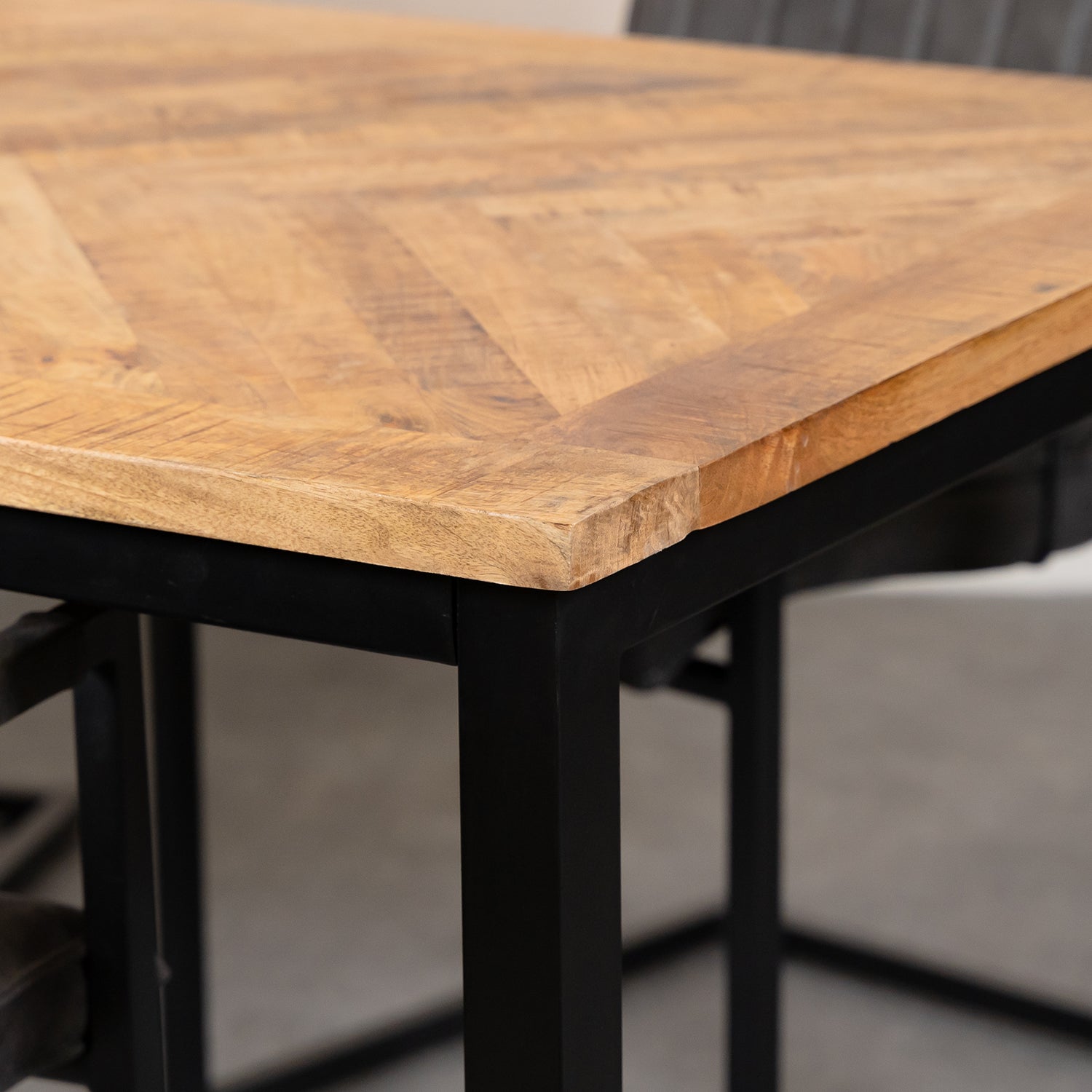 Eetkamertafel Jax heeft een trendy industrieel uiterlijk. De robuuste metalen constructie gepaard met het mangohouten tafelblad vormen een modieuze combinatie. Het tafelblad wordt gekenmerkt door een uniek visgraatmotief.