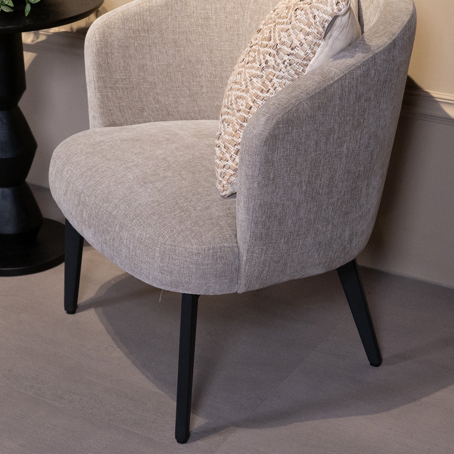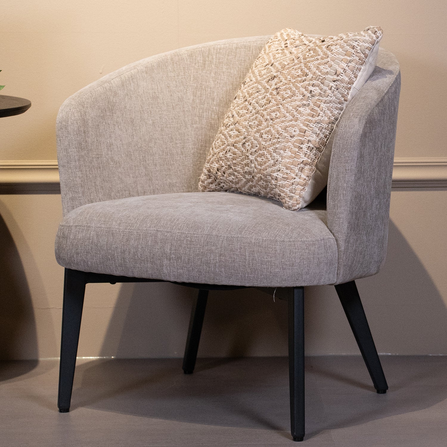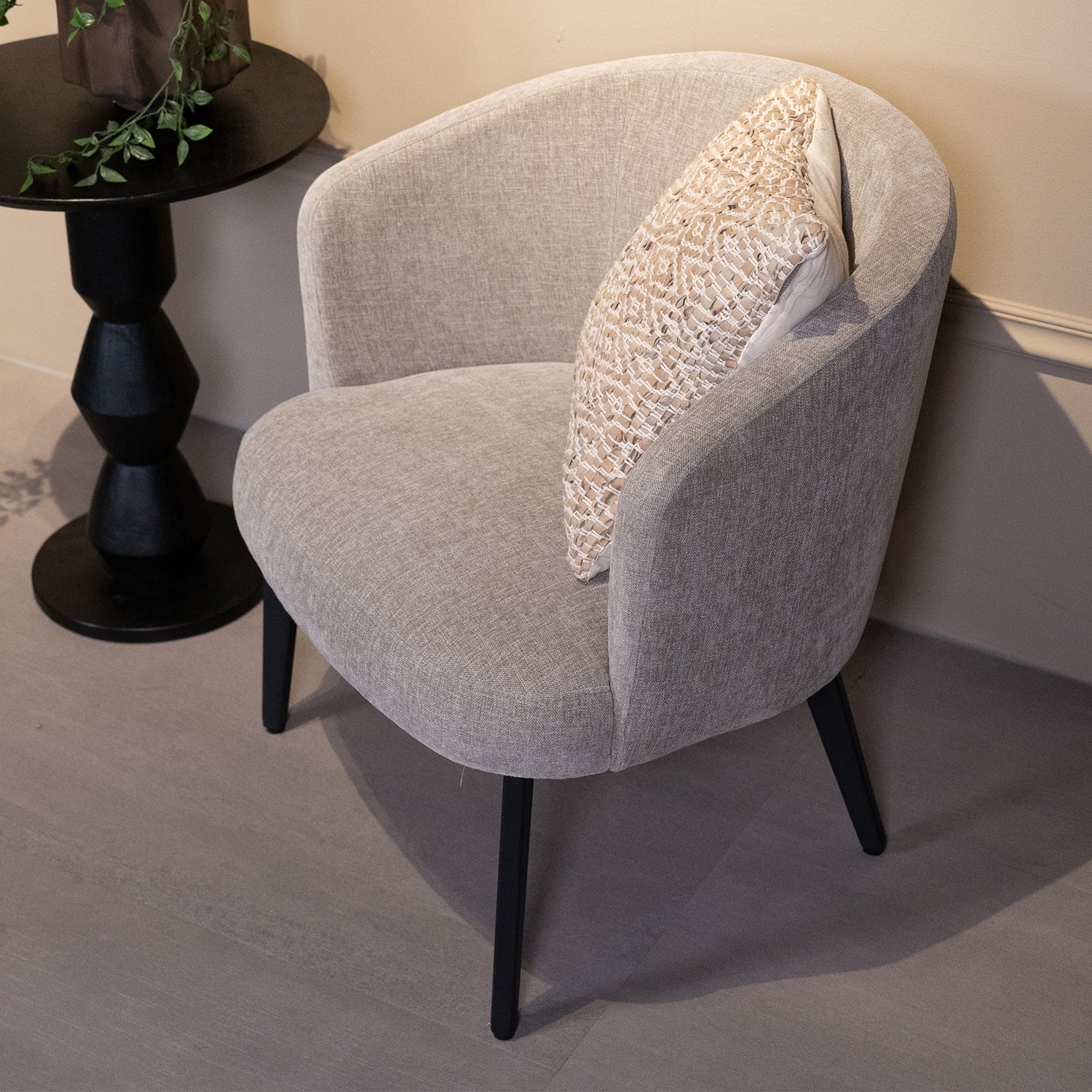 "Fauteuil Albi," bekleed met een stijlvolle beige grijze stof, is niet alleen een prachtige toevoeging aan je eetkamer, maar belichaamt ook ons streven naar kwaliteit. Onze zitmeubelen zijn eenvoudig schoon te houden door de stof te impregneren met onze Textiel impregneerspray, waardoor vloeistoffen en vlekken geen kans krijgen.