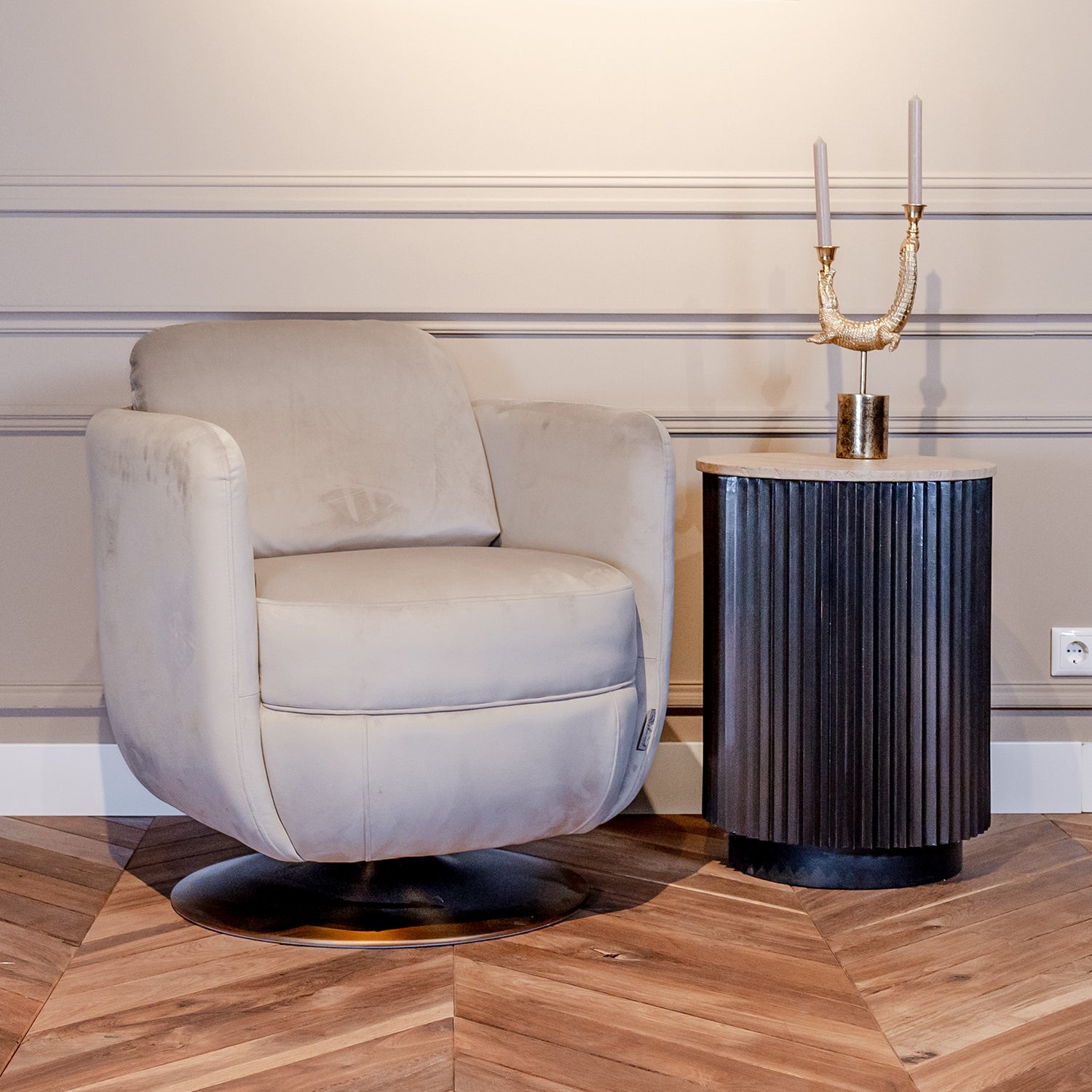 Als kers op de taart is het onderstel vervaardigd uit mat zwart staal, wat opvalt door de ronde metalen plaat op de grond. Dit geeft de ronde fauteuil een luxe uitstraling en zorgt voor stabiliteit. Hierdoor past Draaifauteuil Turner perfect in jouw modern interieur.
