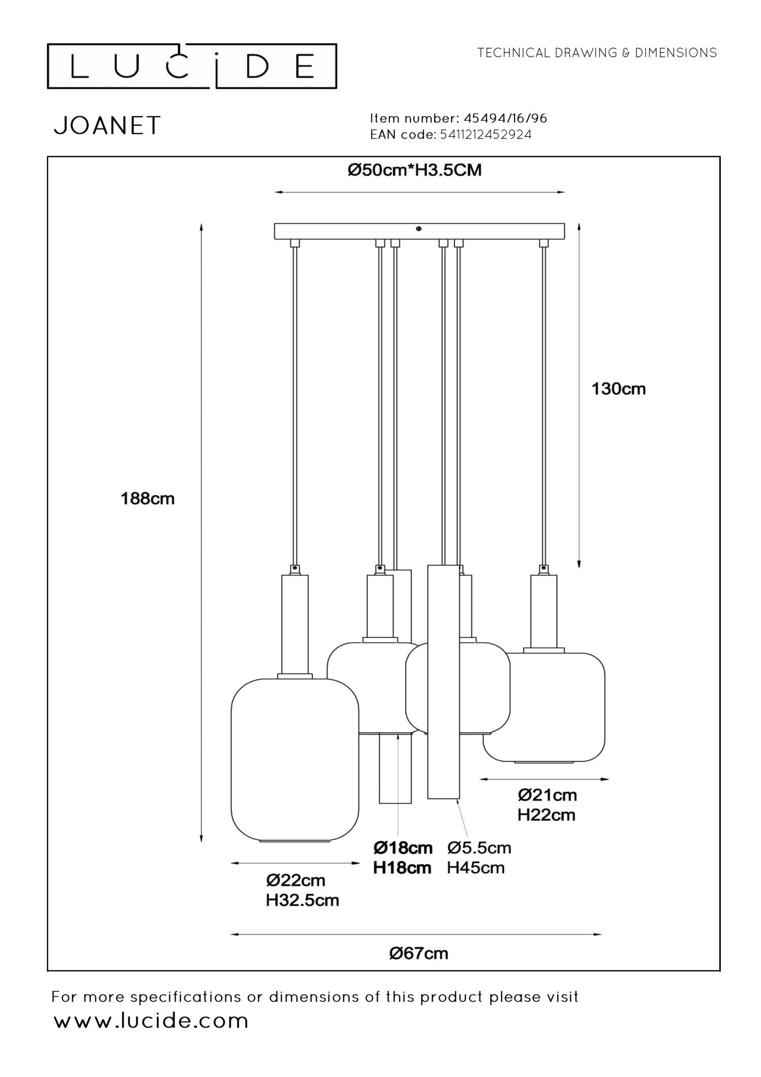 De Lucide Joanet hanglamp is een stijlvolle en functionele keuze voor wie op zoek is naar een combinatie van modern design en klassieke elegantie. Met haar hoogwaardige materialen en veelzijdige toepassing is deze lamp een waardevolle toevoeging aan uw interieur.