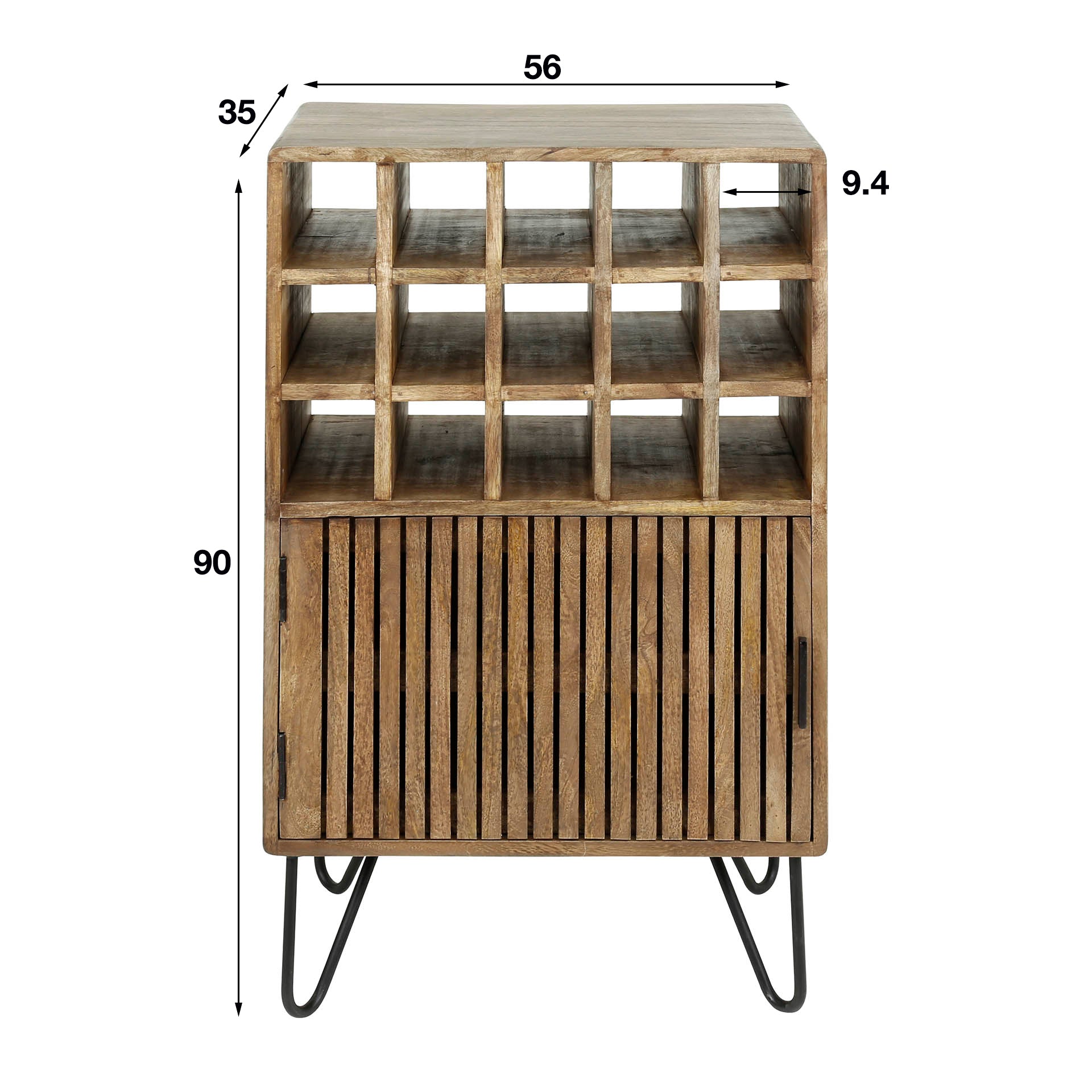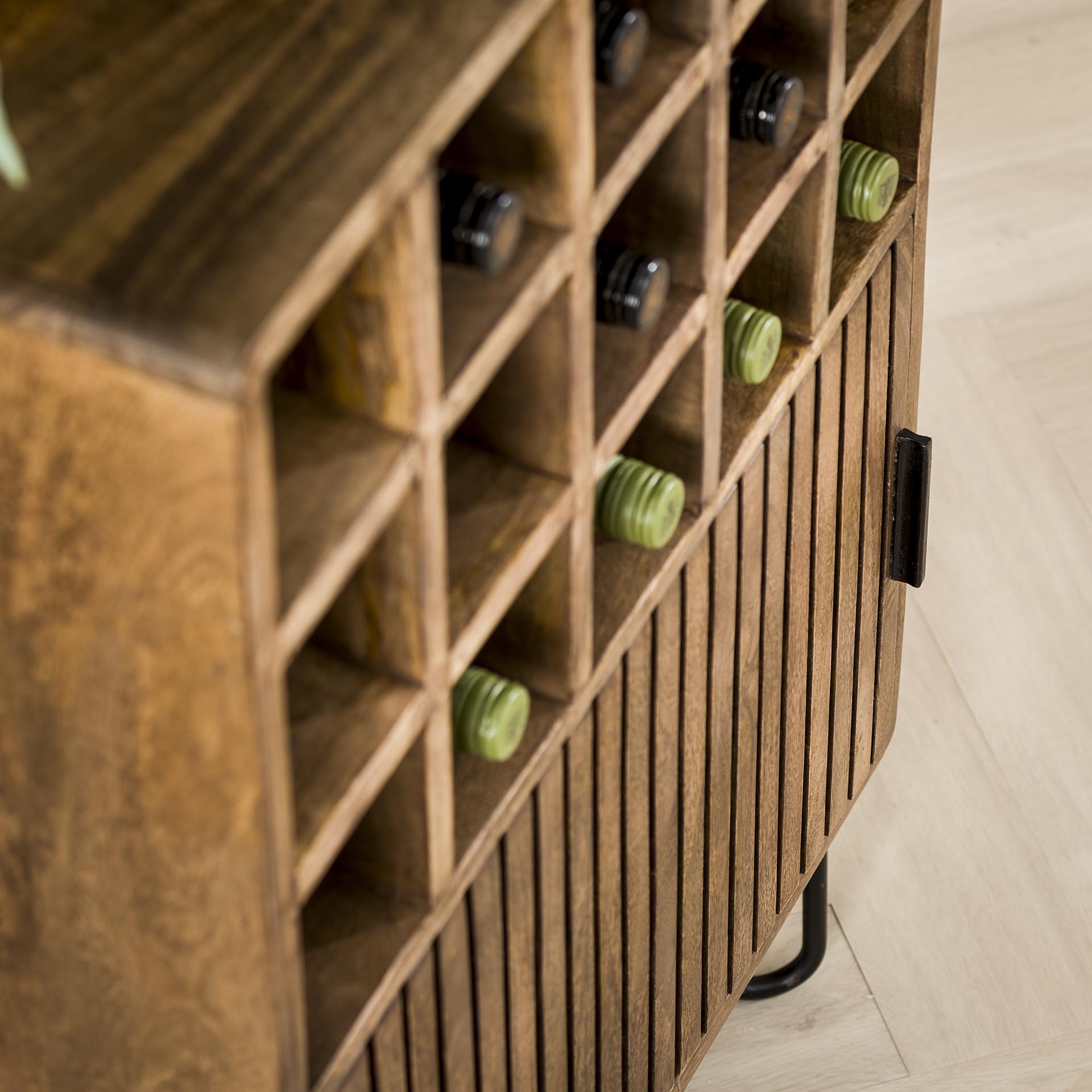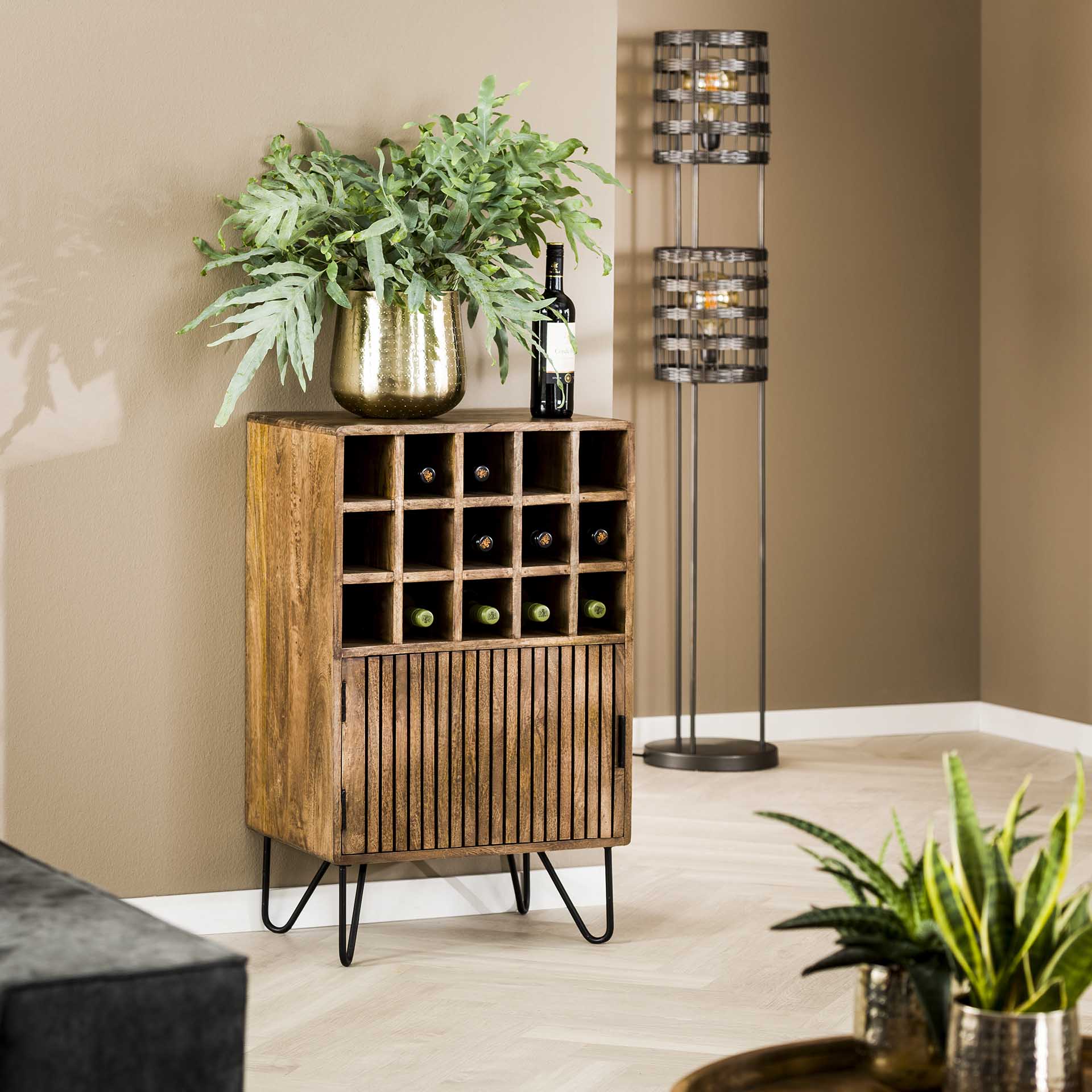 Niets beters dan een lekker wijntje na een dag hard werken! Berg je wijnflessen modieus op in onze prachtige mangohouten wijnkast. Het retro design en het organische materiaal vormen een ontzettend trendy meubelstuk. De wijnkast beschikt over 15 wijnvakken en 1 deur.