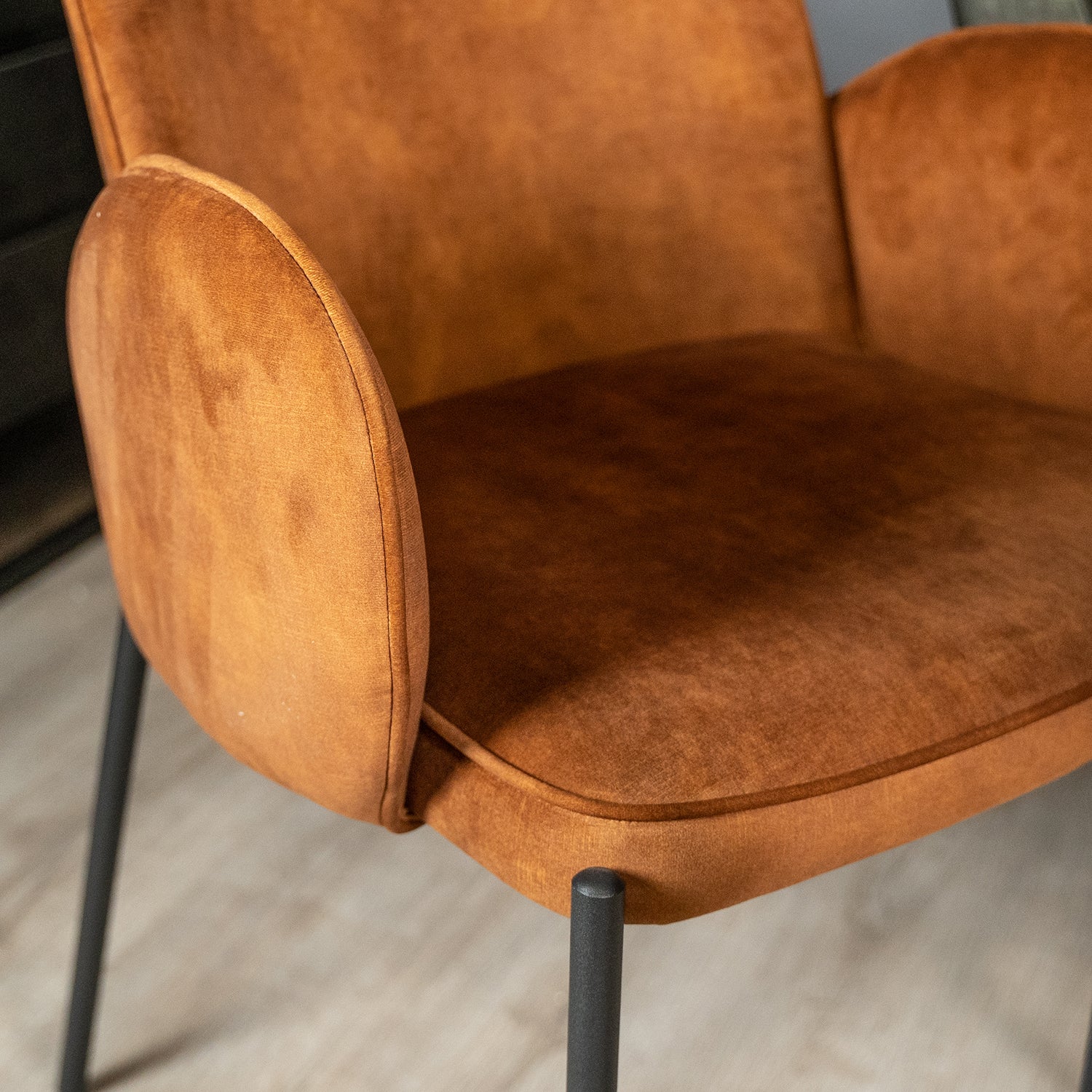 Deze velours stoel met organische vormen zorgt ervoor dat je comfortabel kunt zitten aan tafel. Het degelijke design in combinatie met het aangename materiaal stimuleert een optimale zitpositie. De achterste metalen poten lopen schuin naar buiten waardoor de stoel stevig staat.