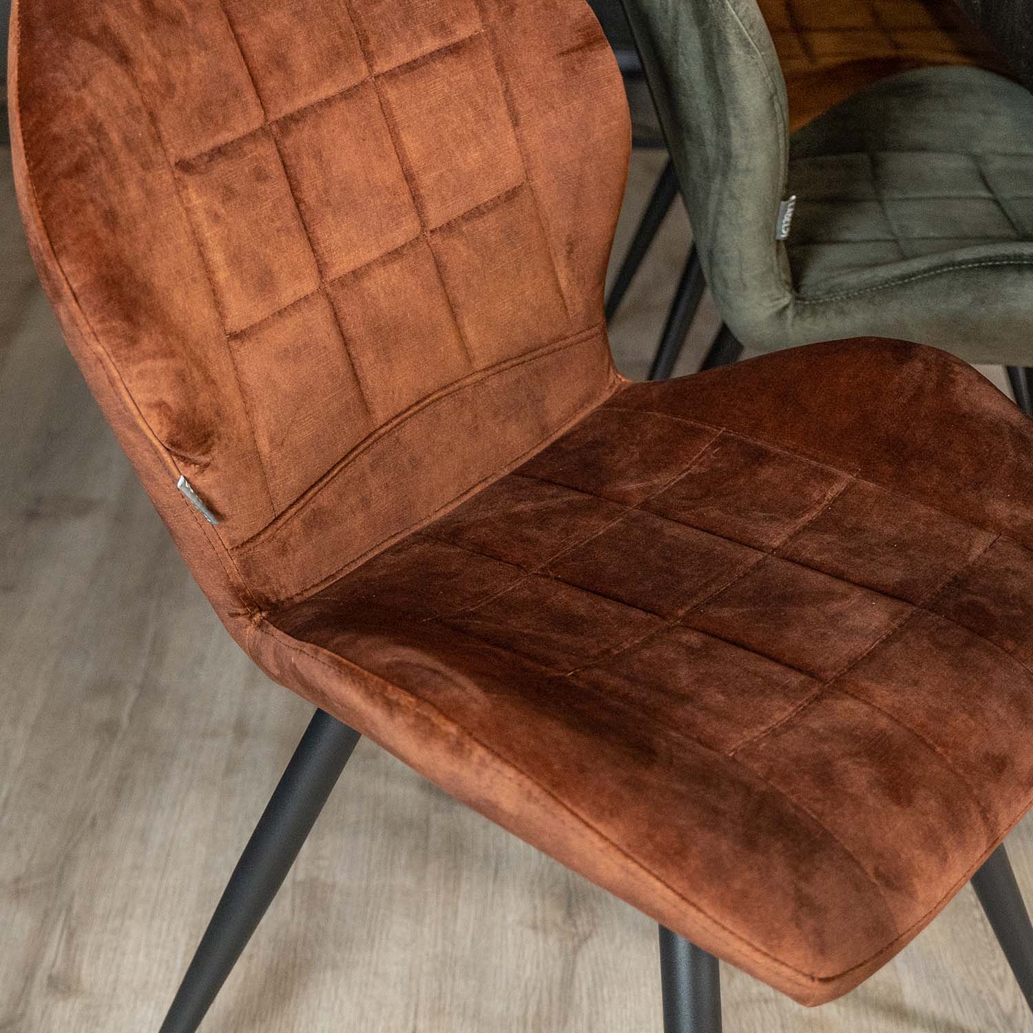 Deze Velvet Eetkamerstoel is beschikbaar in de kleuren: Hunter, Oker en Rust. Daarnaast is deze stoel ook beschikbaar in Microvezel Antraciet, Microvezel Army en Microvezel Cognac.