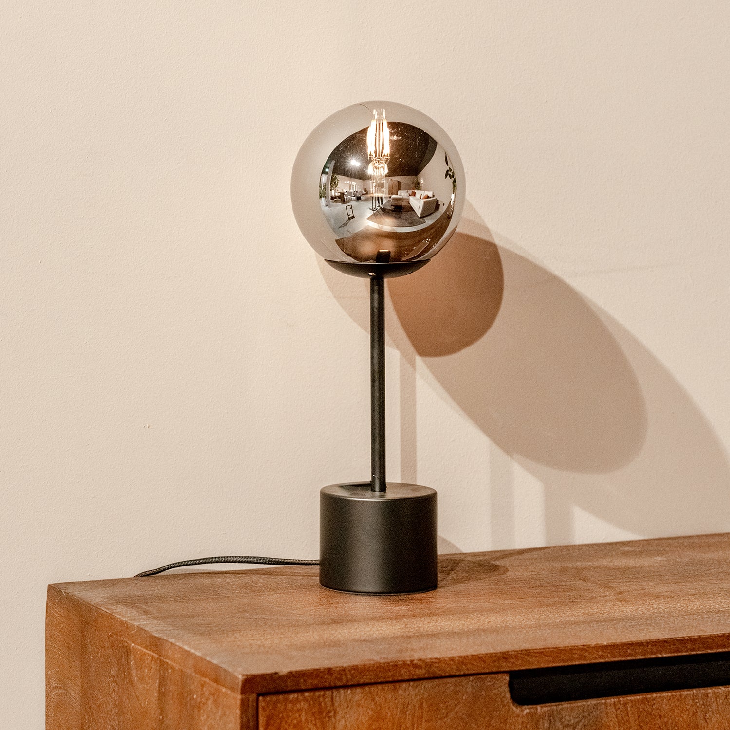 Maak kennis met de Tafellamp Fumo in Smoke Glas. De Tafellamp heeft een metalen basis en een bol van smoke glas. Of het nu brandt of niet, het smoke glas creëert direct sfeer. De lamp is perfect voor op een tafel, dressoir of zelfs in een kast vanwege zijn unieke vorm en grootte.