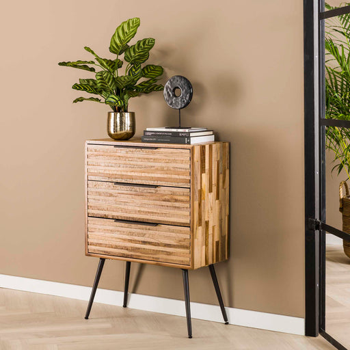 Onze ladekasten worden voornamelijk gemaakt van duurzaam mangohout, eikenfineer en metaal. Deze materialen staan bekend om hun kwaliteit en lange levensduur.