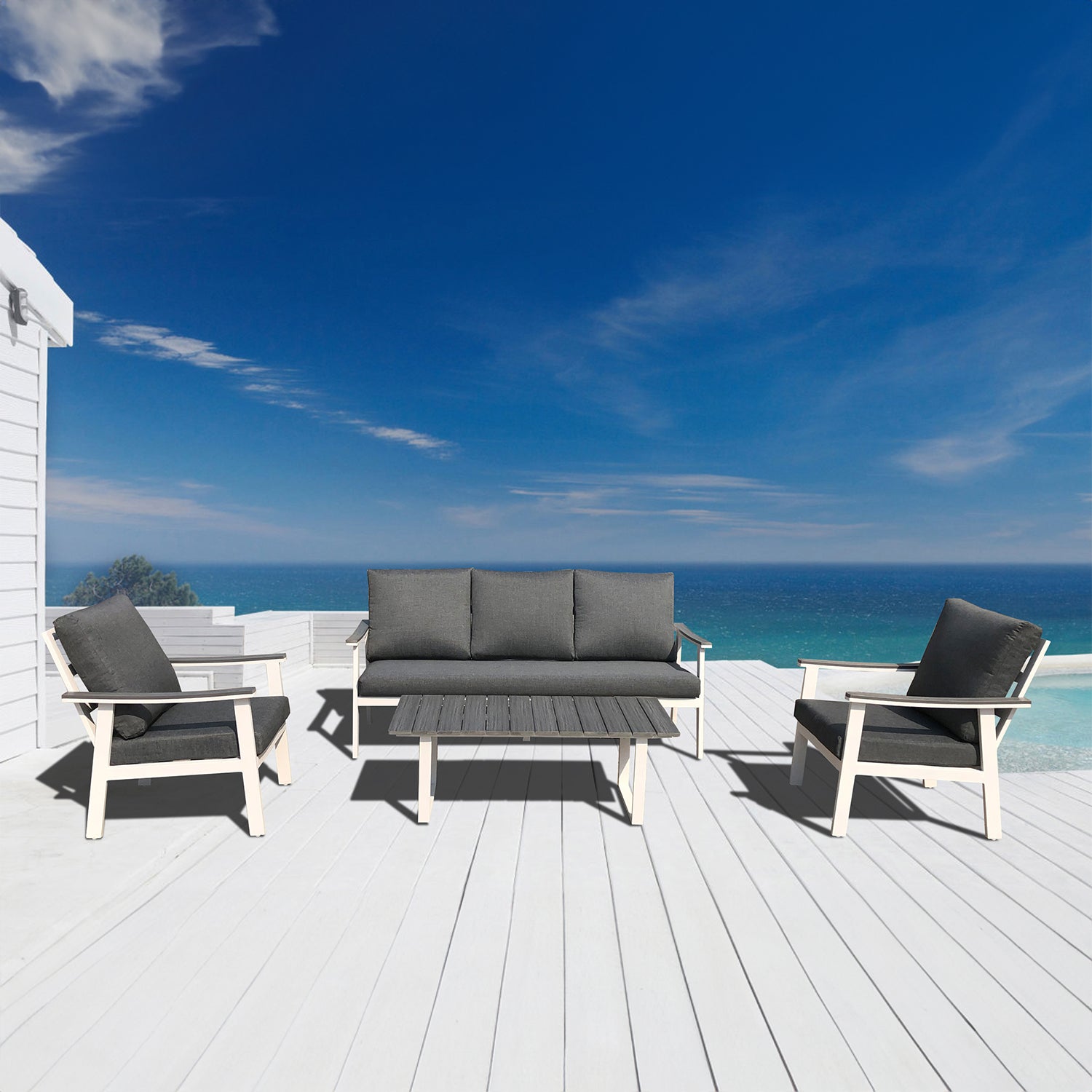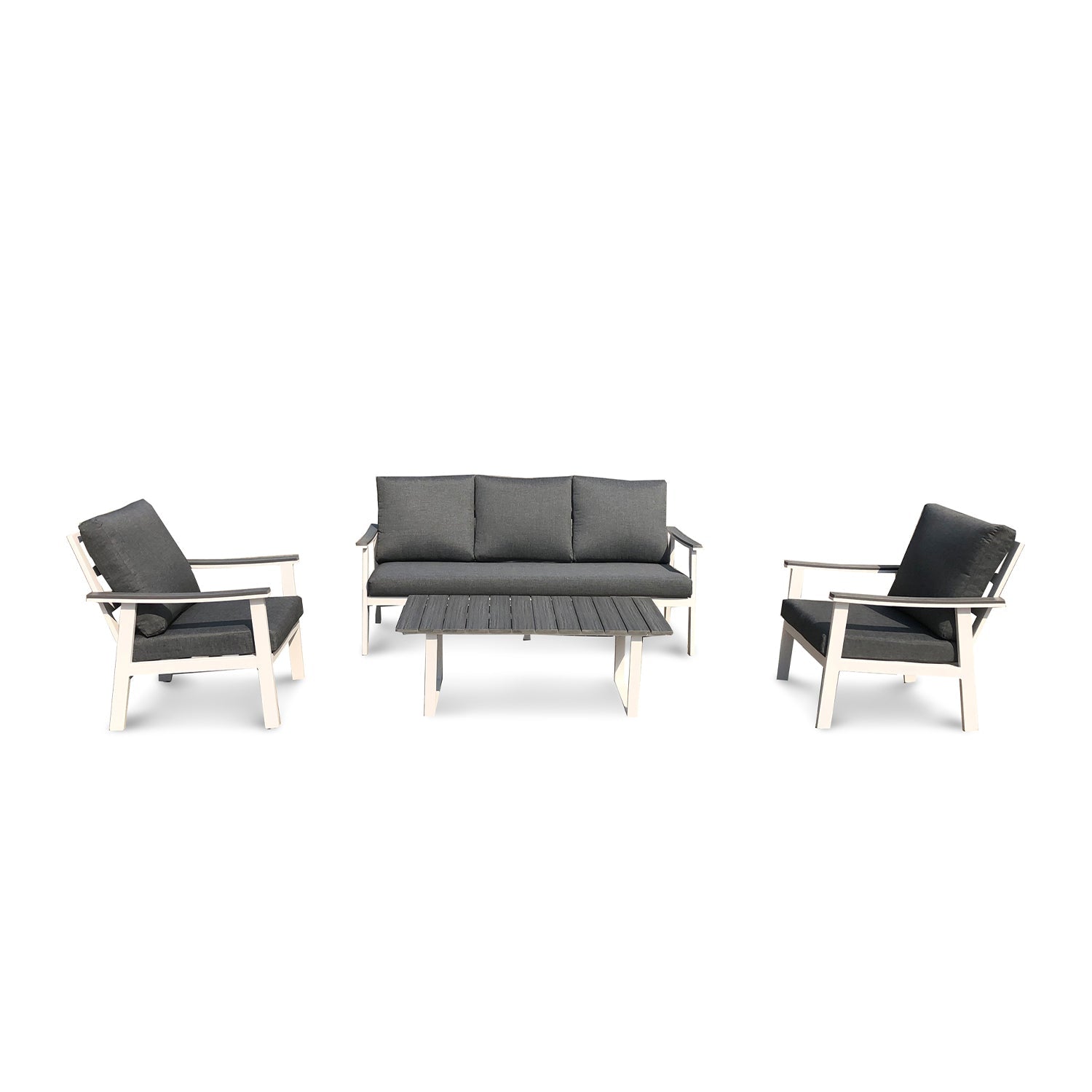 Maak kennis met onze Loungeset Dublin in Wit. Deze loungeset bestaat uit een bijzettafel, drie persoons bank en twee stoelen, voorzien van zachte kussens voor een heerlijke zitervaring. Of je nu wilt relaxen met een goed boek of genieten van een verfrissend drankje, deze tuinbank en tuinstoelen zorgen voor ultiem comfort terwijl je geniet van de frisse buitenlucht met je Loungeset lounge.
