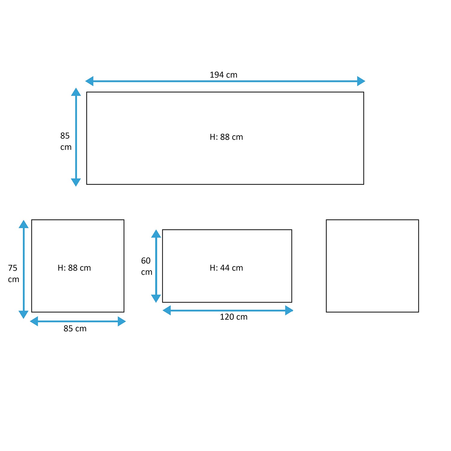 De afmetingen van de bank is 194x85x88 cm, de stoelen 76,85,88 en de bijzettafel is 124x60x44 cm.