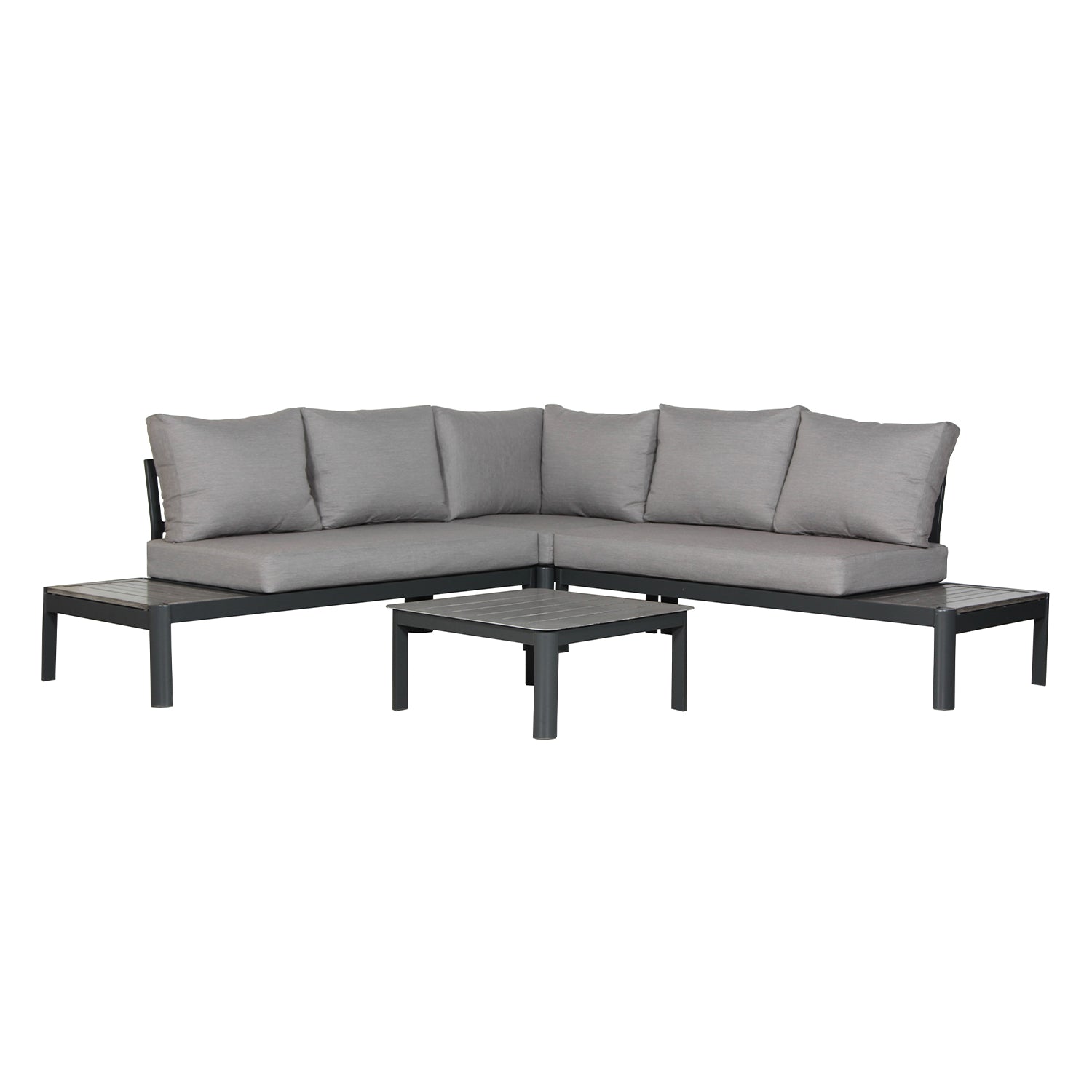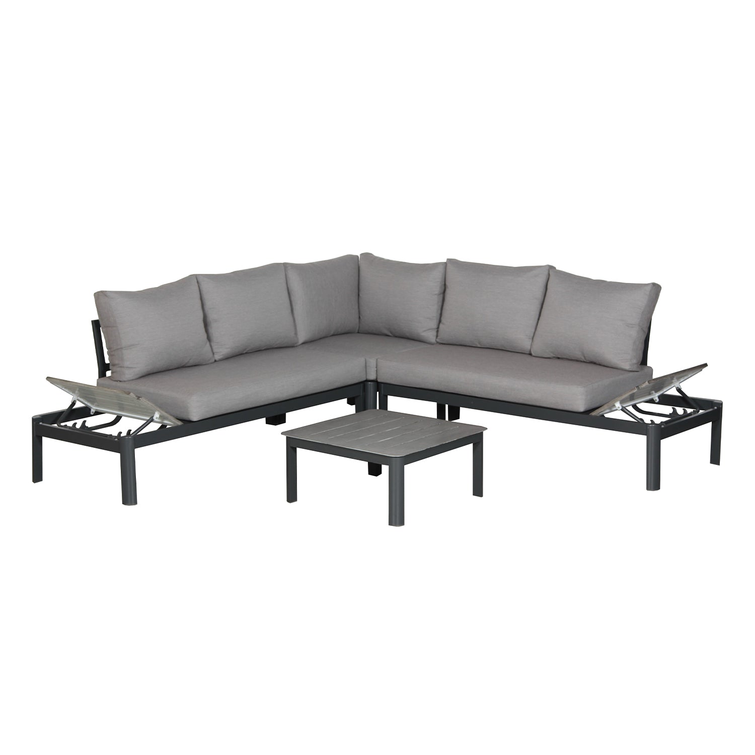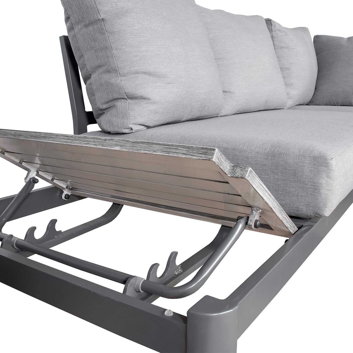 Maak kennis met onze Loungeset Leroy in Grijs. Deze set bestaat uit een bijzettafel en een luxe bank, voorzien van extra tafelblad aan de zijkant van de bank waar je je spullen op kan zetten. Of je nu wilt relaxen met een goed boek of genieten van een verfrissend drankje, deze tuinbank zorgt voor ultiem comfort terwijl je geniet van de frisse buitenlucht met je Loungeset lounge. De bank kan aan één kant omhoog worden gebracht, waardoor je eenvoudig een comfortabele ligbank kunt creëren.