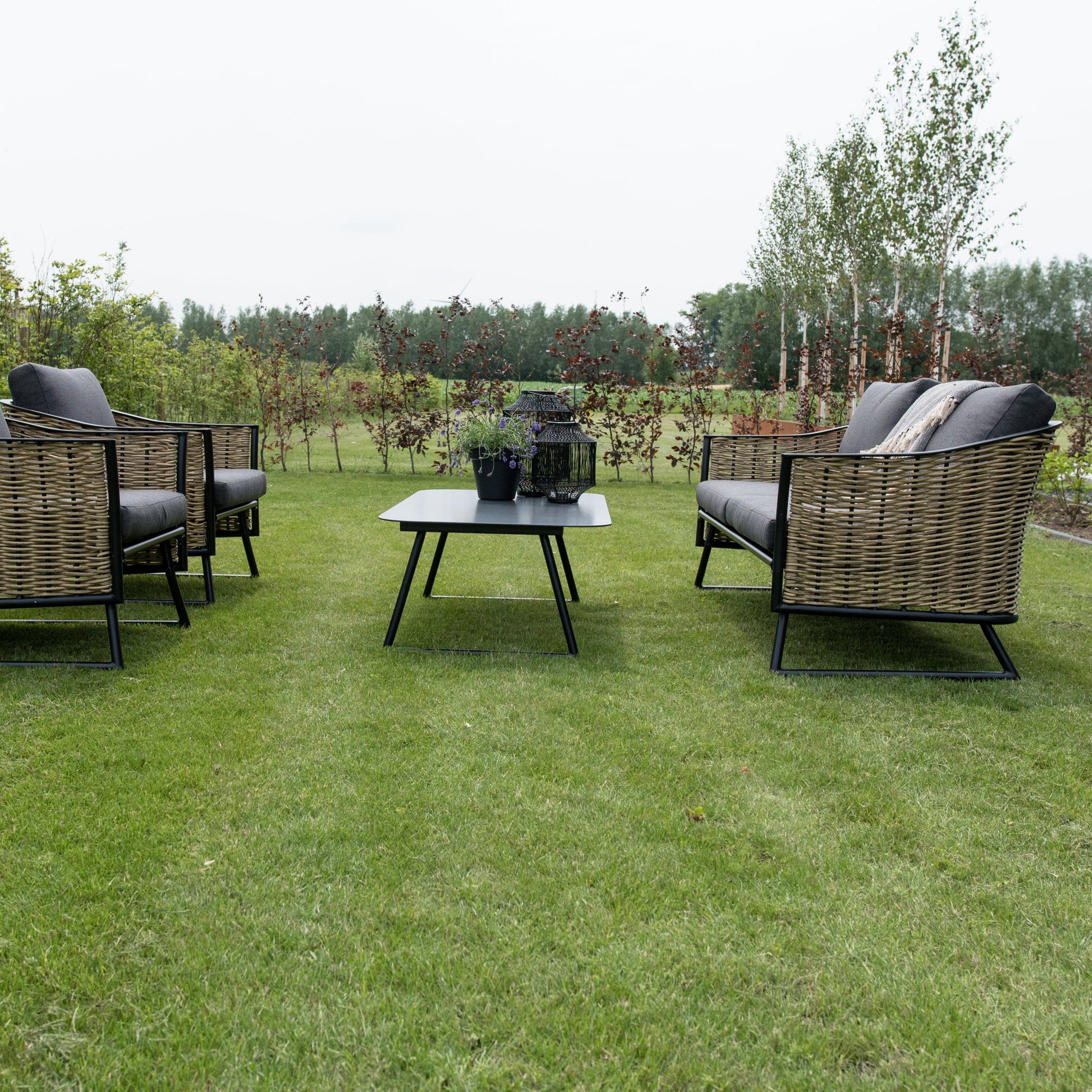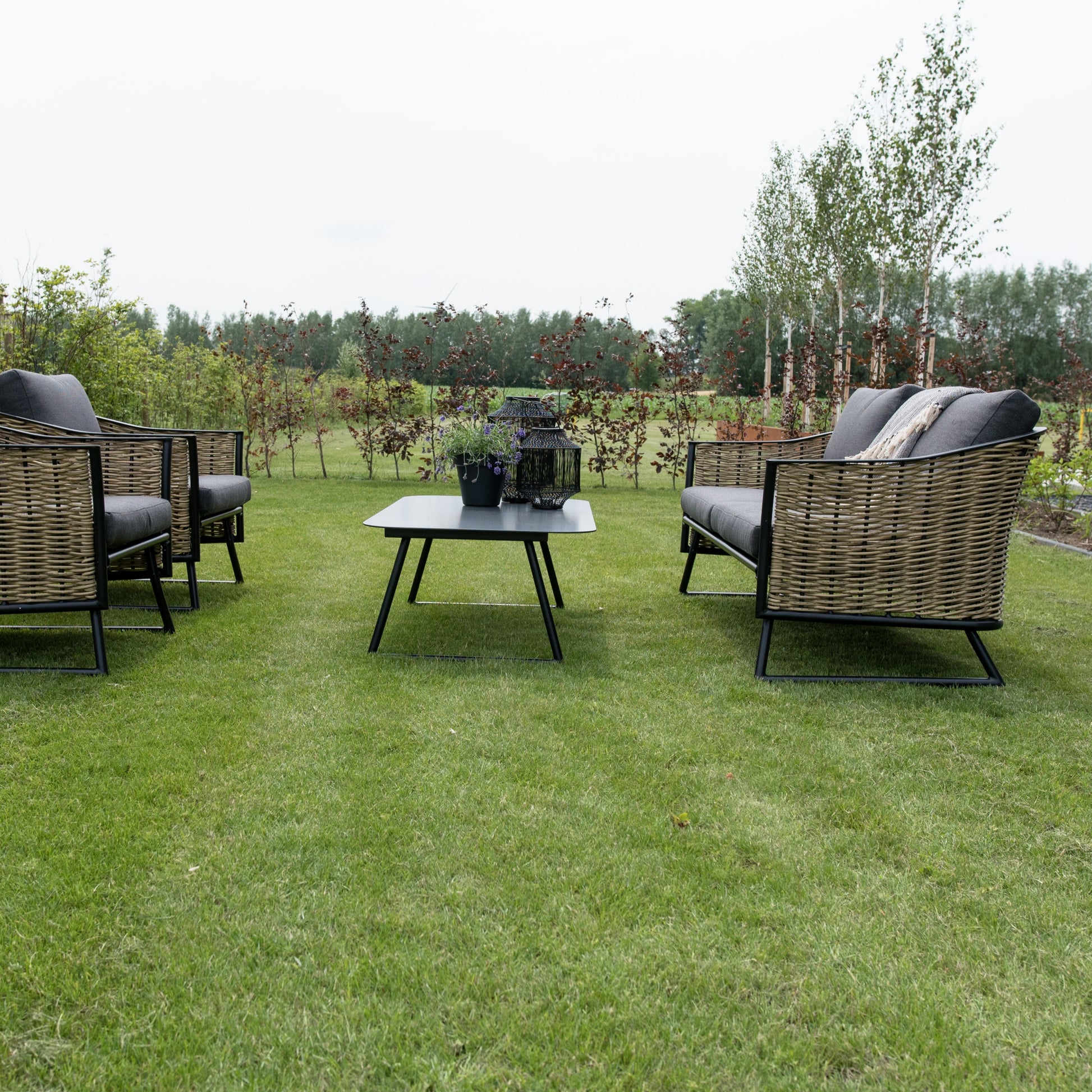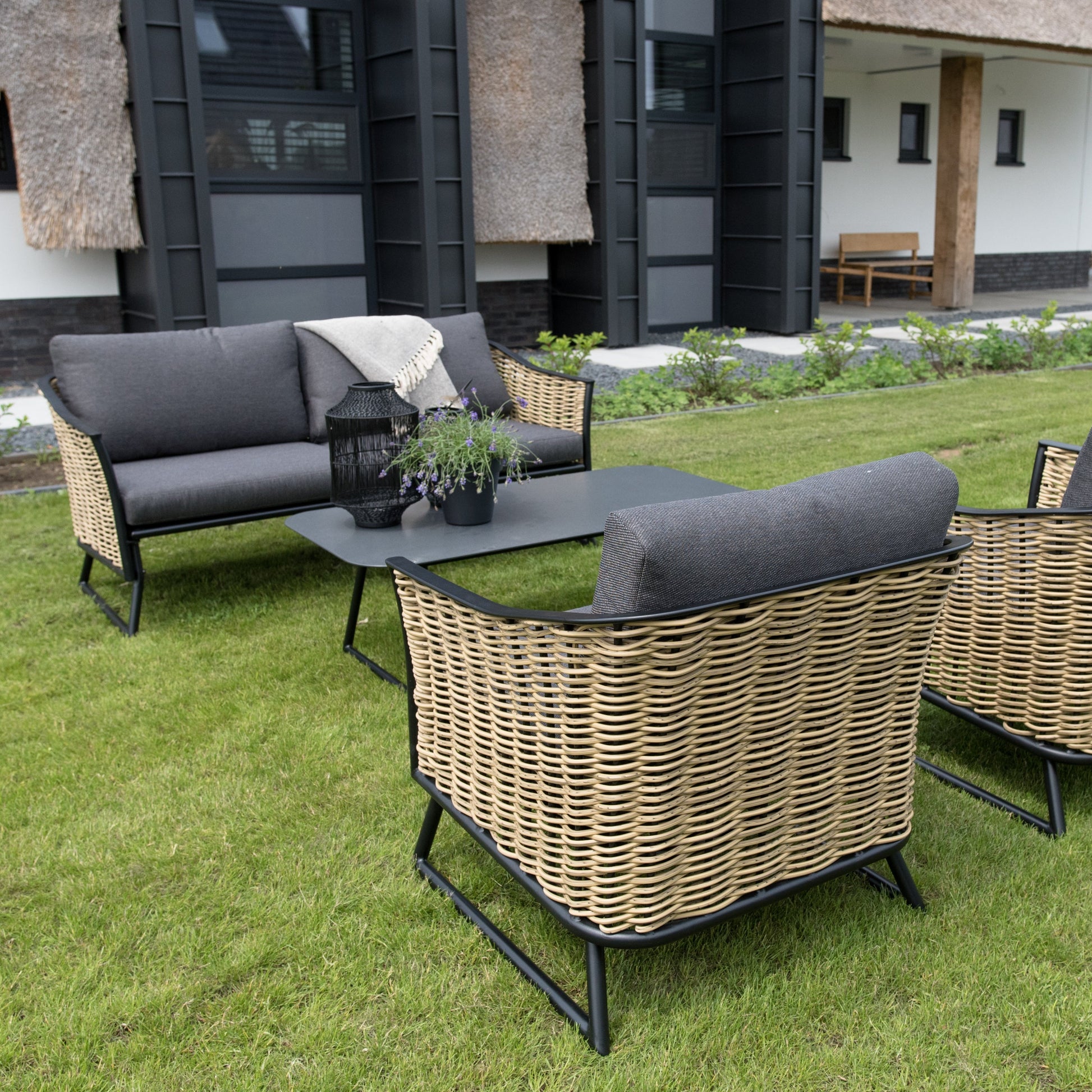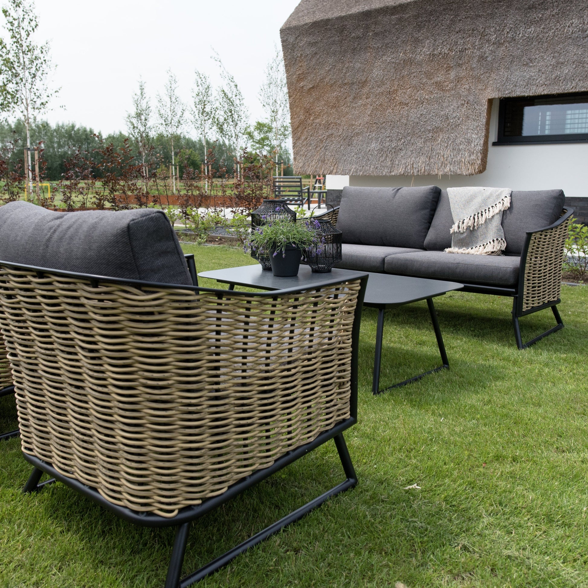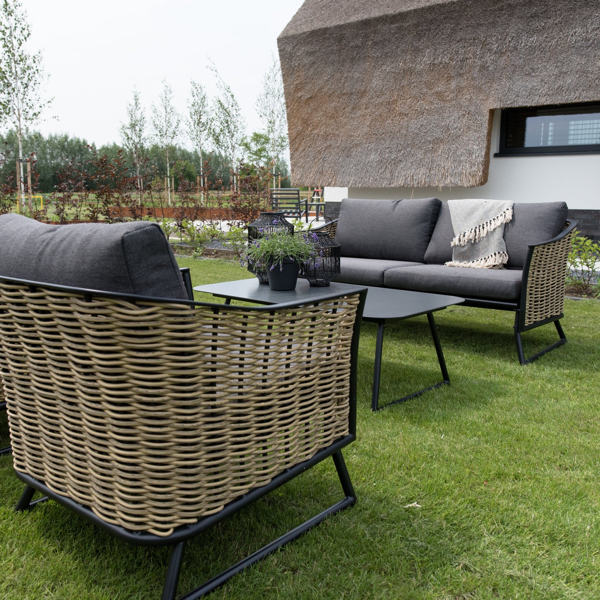 De loungeset bestaat uit drie prachtige stukken: een ruime stoel, een comfortabele bank van 161,5x75x70 cm en een elegante tafel van 120x65x40 cm. Elk stuk is vervaardigd met een stevig aluminium frame in een matte zwarte afwerking. Het frame is omwikkeld met wicker in een natuurlijke kleur, wat ook zorgt voor extra stevigheid en comfort.