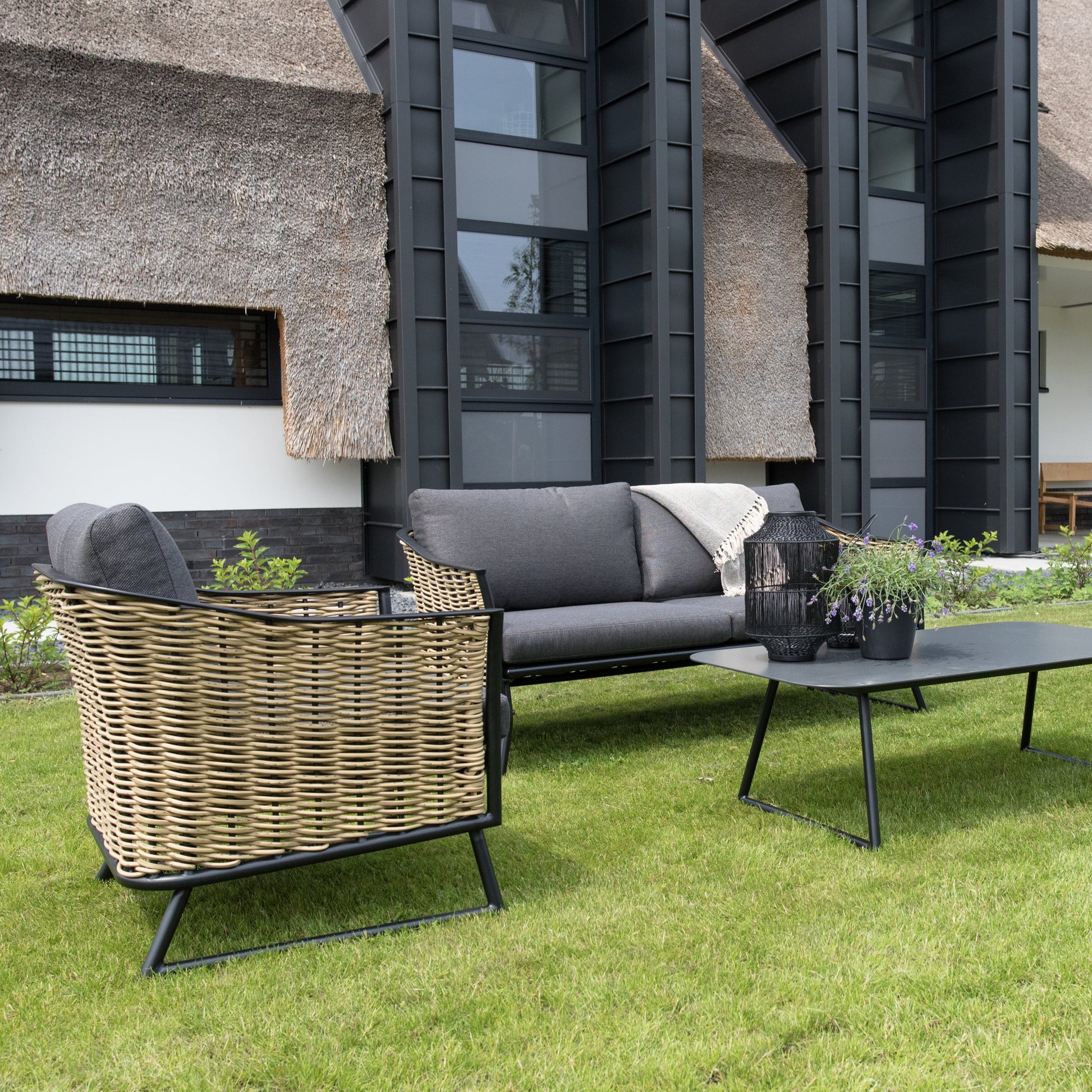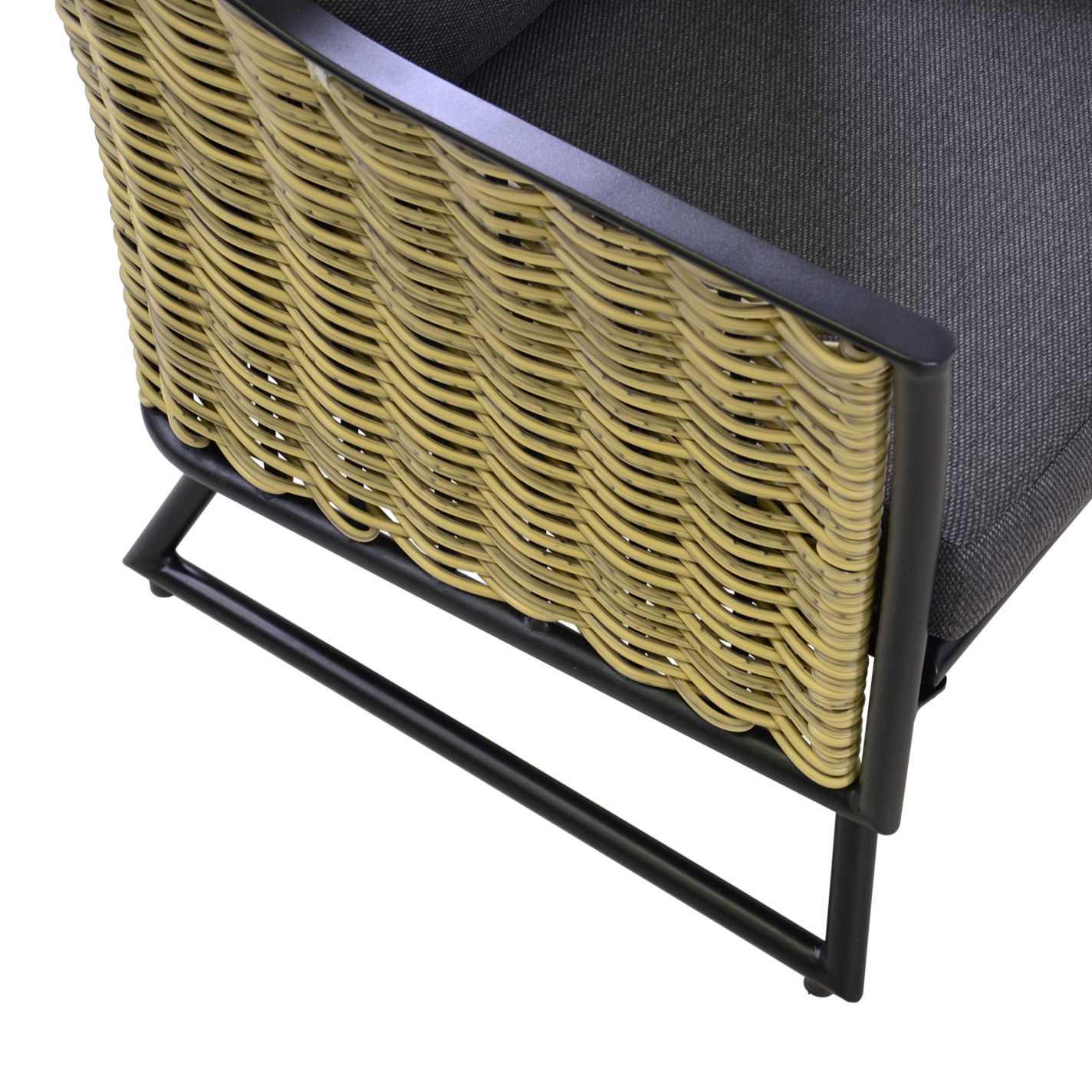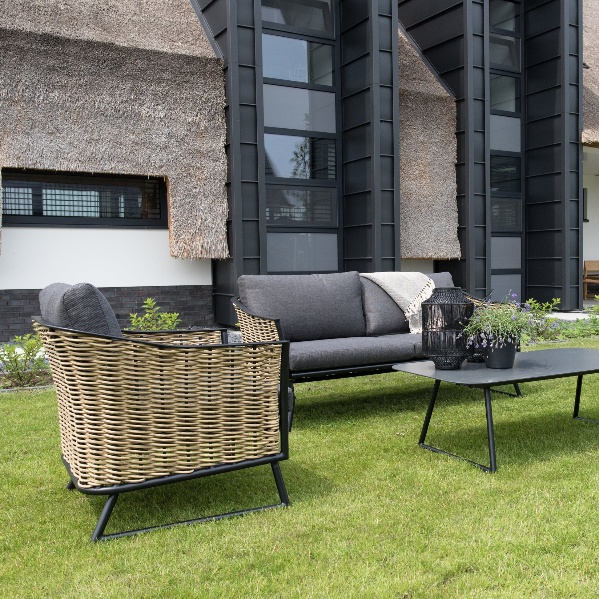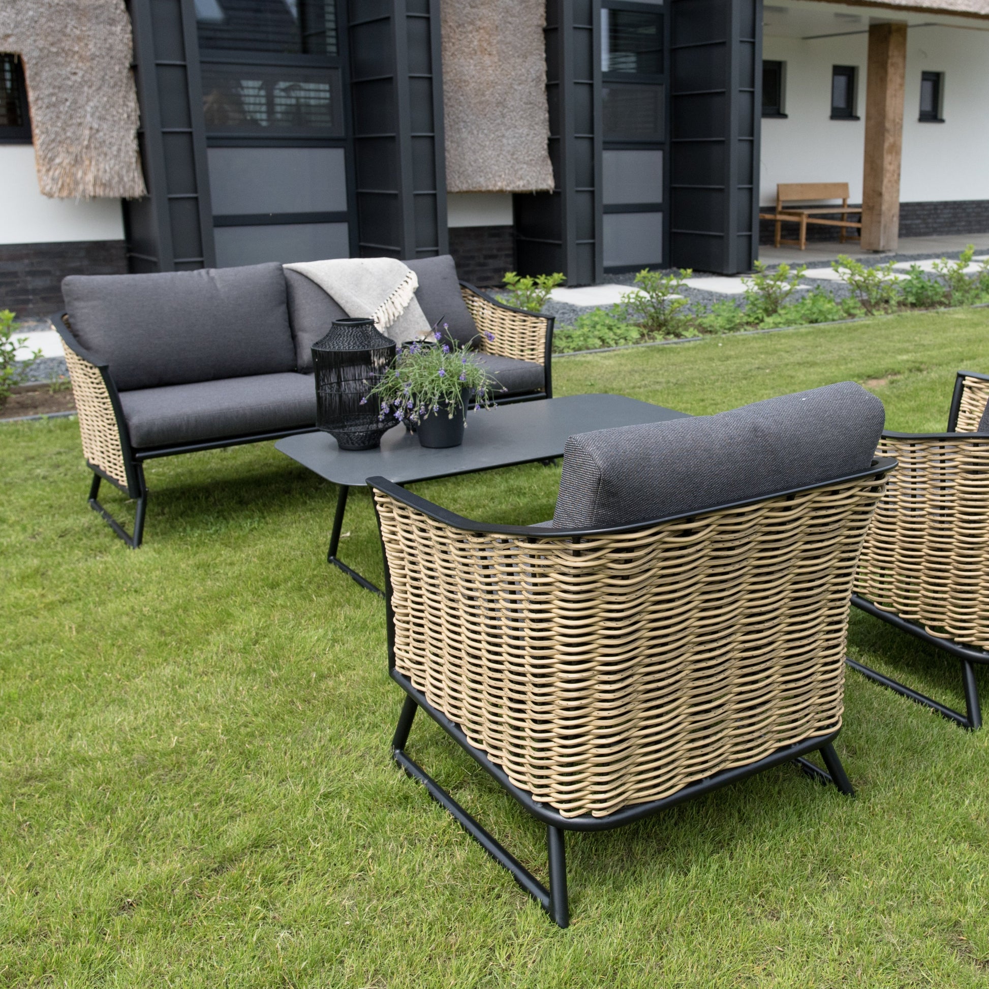 De loungeset bestaat uit drie prachtige stukken: een ruime stoel, een comfortabele bank van 161,5x75x70 cm en een elegante tafel van 120x65x40 cm. Elk stuk is vervaardigd met een stevig aluminium frame in een matte zwarte afwerking. Het frame is omwikkeld met wicker in een natuurlijke kleur, wat ook zorgt voor extra stevigheid en comfort.