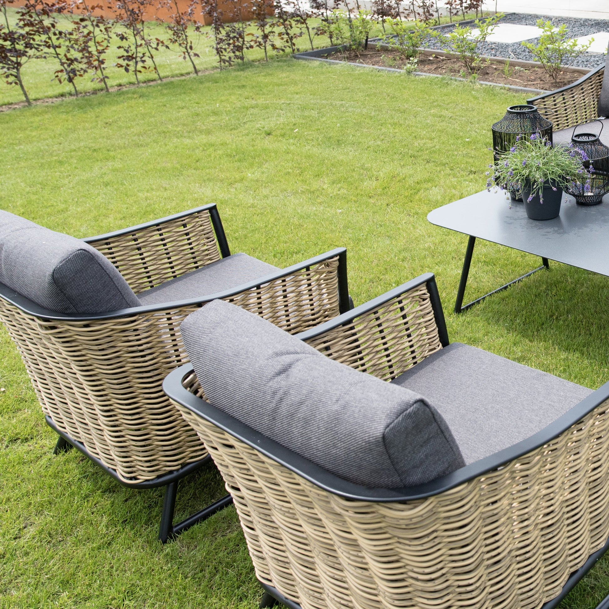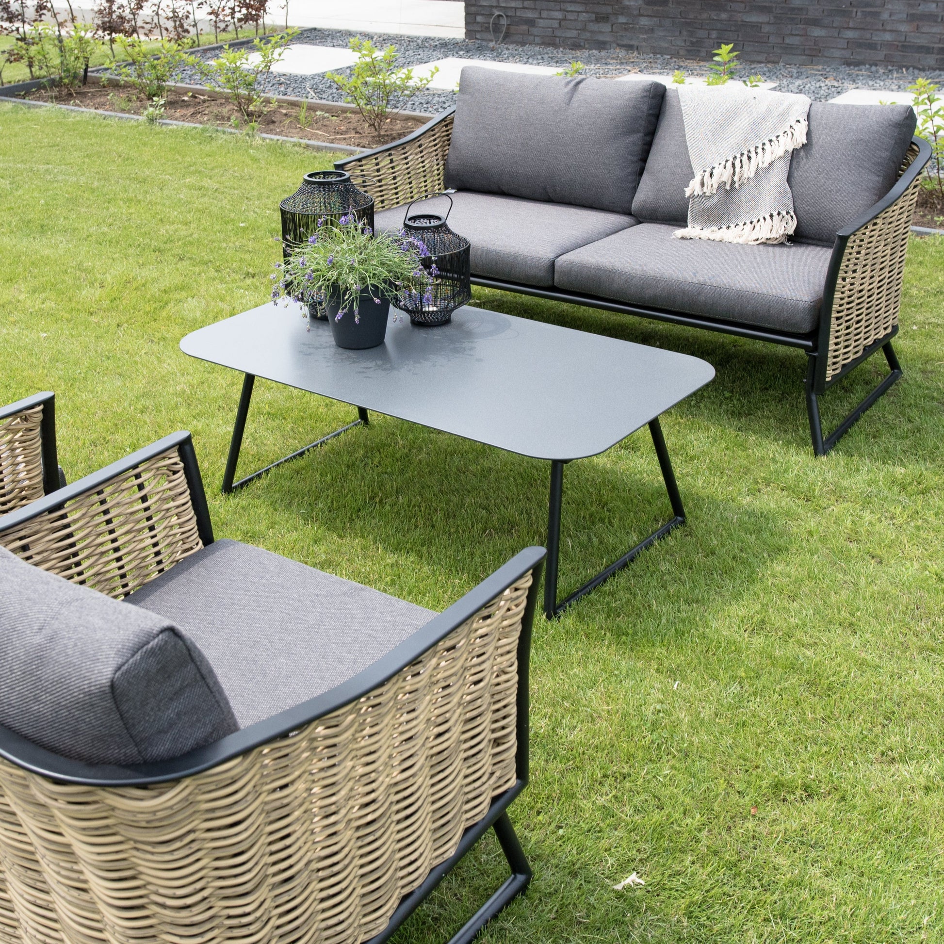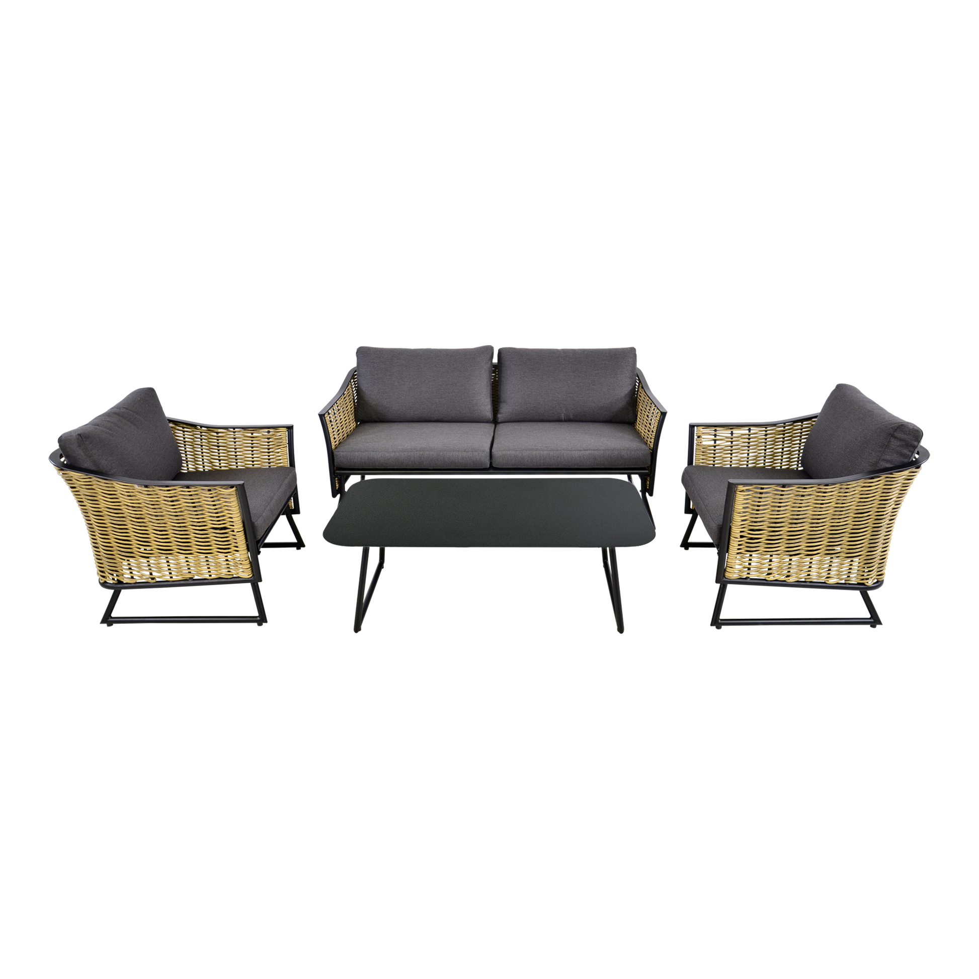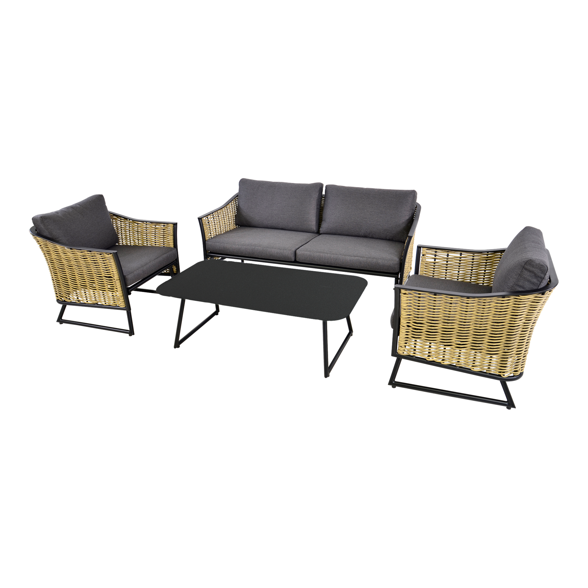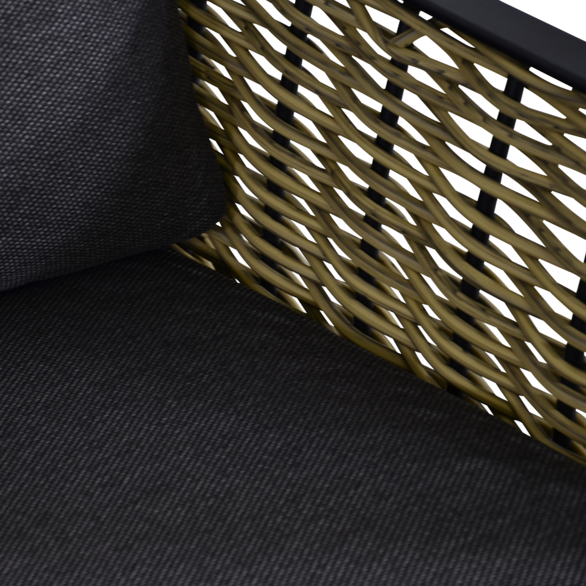 De loungeset bestaat uit drie prachtige stukken: een ruime stoel, een comfortabele bank van 161,5x75x70 cm en een elegante tafel van 120x65x40 cm. Elk stuk is vervaardigd met een stevig aluminium frame in een matte zwarte afwerking. Het frame is omwikkeld met wicker in een natuurlijke kleur, wat ook zorgt voor extra stevigheid en comfort.