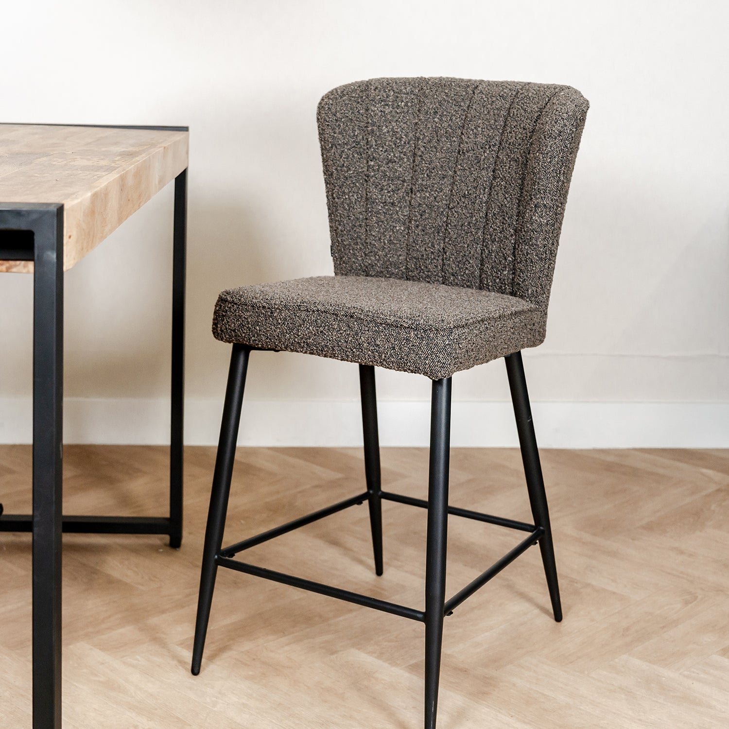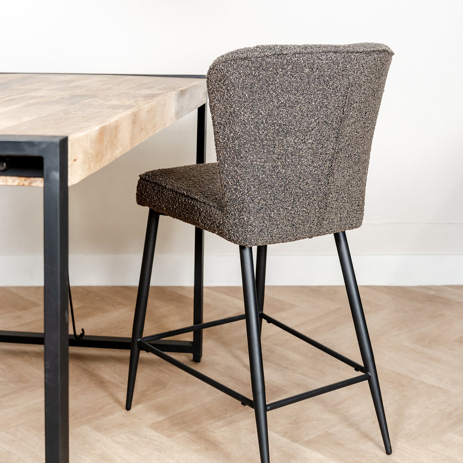 Barstoel Fermo is bekleed met de zachte stof bouclé en is verkrijgbaar in verschillende fijne kleuren. De barstoel is enorm comfortabel door de extra vulling in de rugleuning en de zitting. De bouclé stof geeft een zachte, aangename zitervaring en voegt een vleugje luxe toe aan jouw interieur. Het onderstel is gemaakt van metaal met een stoere zwarte afwerking.
