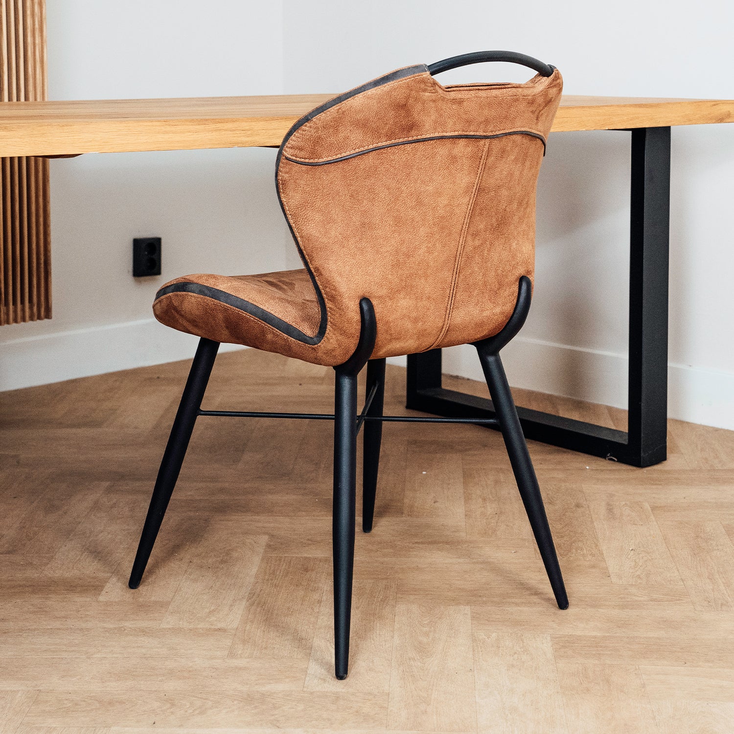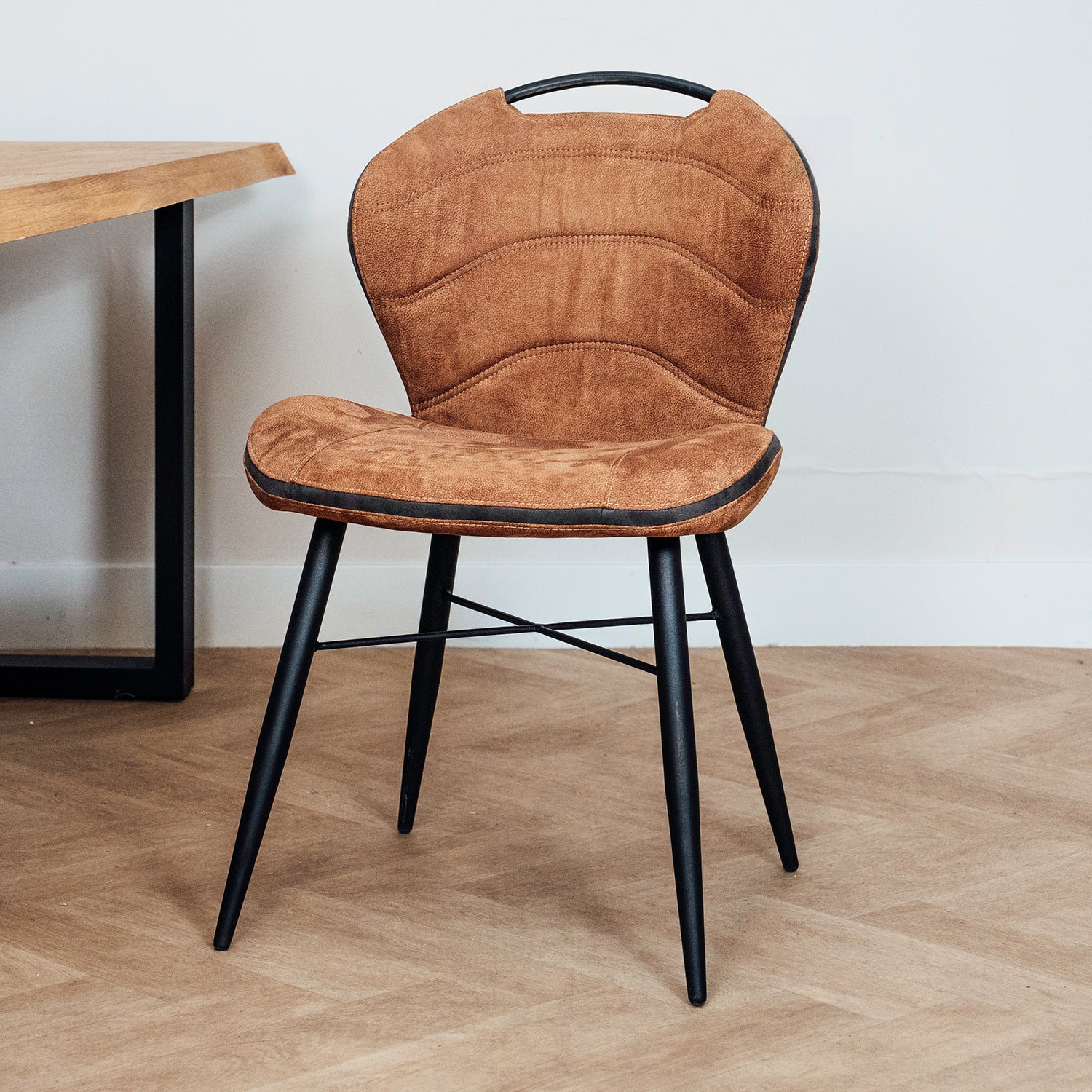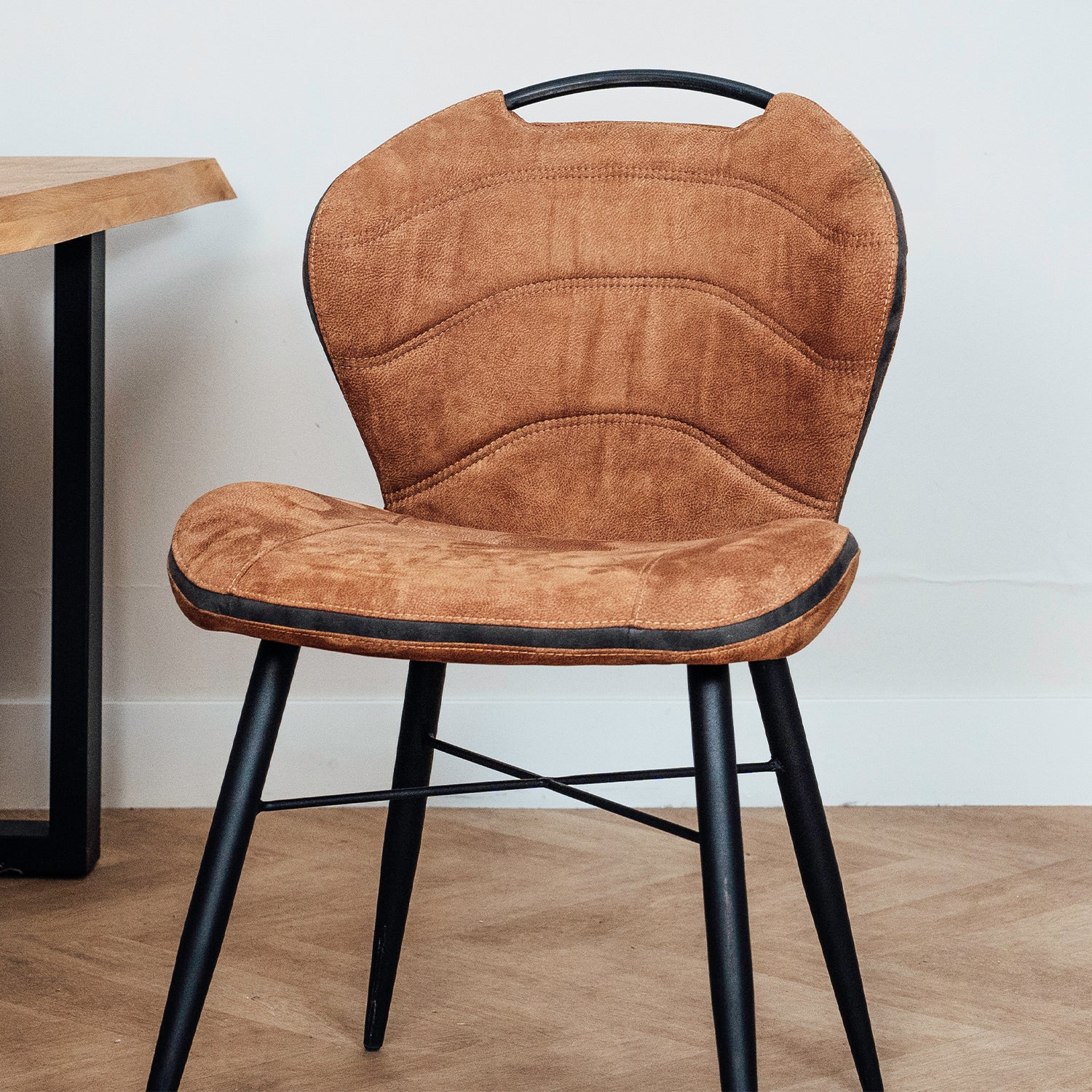 - Stevig metalen onderstel: Het zwarte metalen frame geeft de stoel een moderne en industriële uitstraling en zorgt voor een stabiele basis.