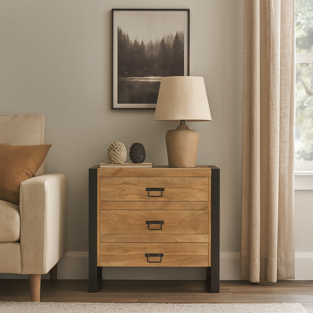 De ladekast Britt is een zeer mooie en modieuze ladekast gemaakt van hoogwaardig mangohout. De poten zijn gemaakt van staal en ze zijn afgewerkt met een mat zwarte verflaag. De ladekast heeft drie grote lades waar je erg veel spullen in kwijt kunt.