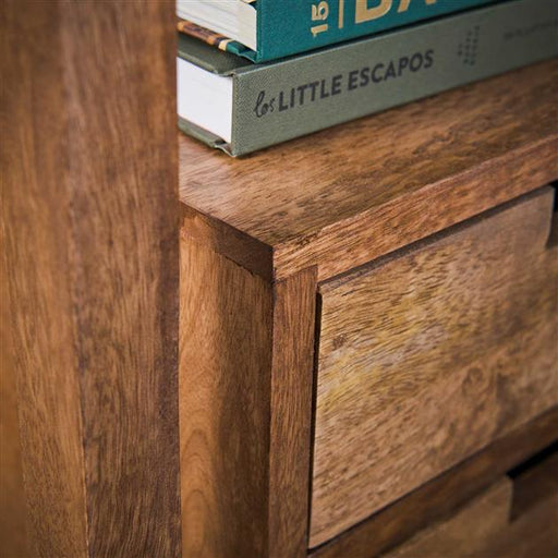 Een volledig houten nachtkastje in mangohout straalt warmte en gezelligheid uit. Combineer met andere houten meubels voor een harmonieus geheel.