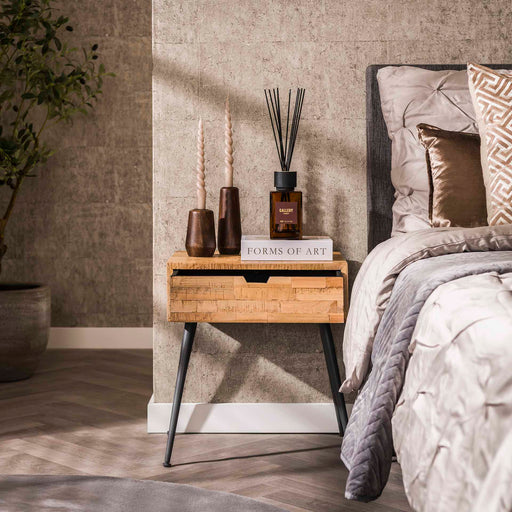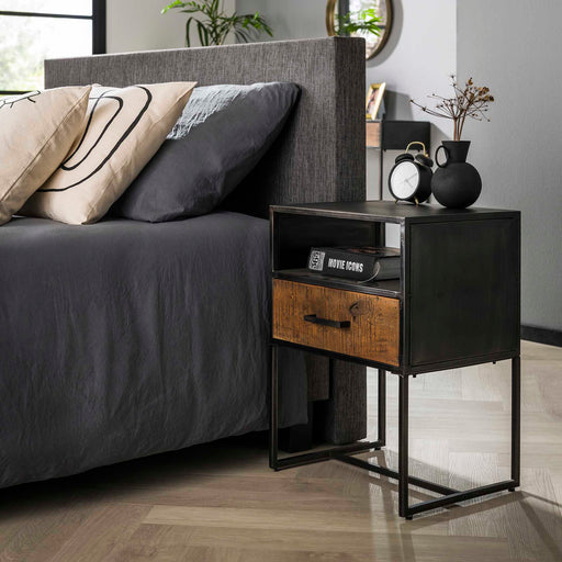 Voor een stoerdere look kies je een nachtkastje van mangohout met metalen details. Denk aan een zwart stalen frame of handgrepen die de industriële uitstraling versterken.