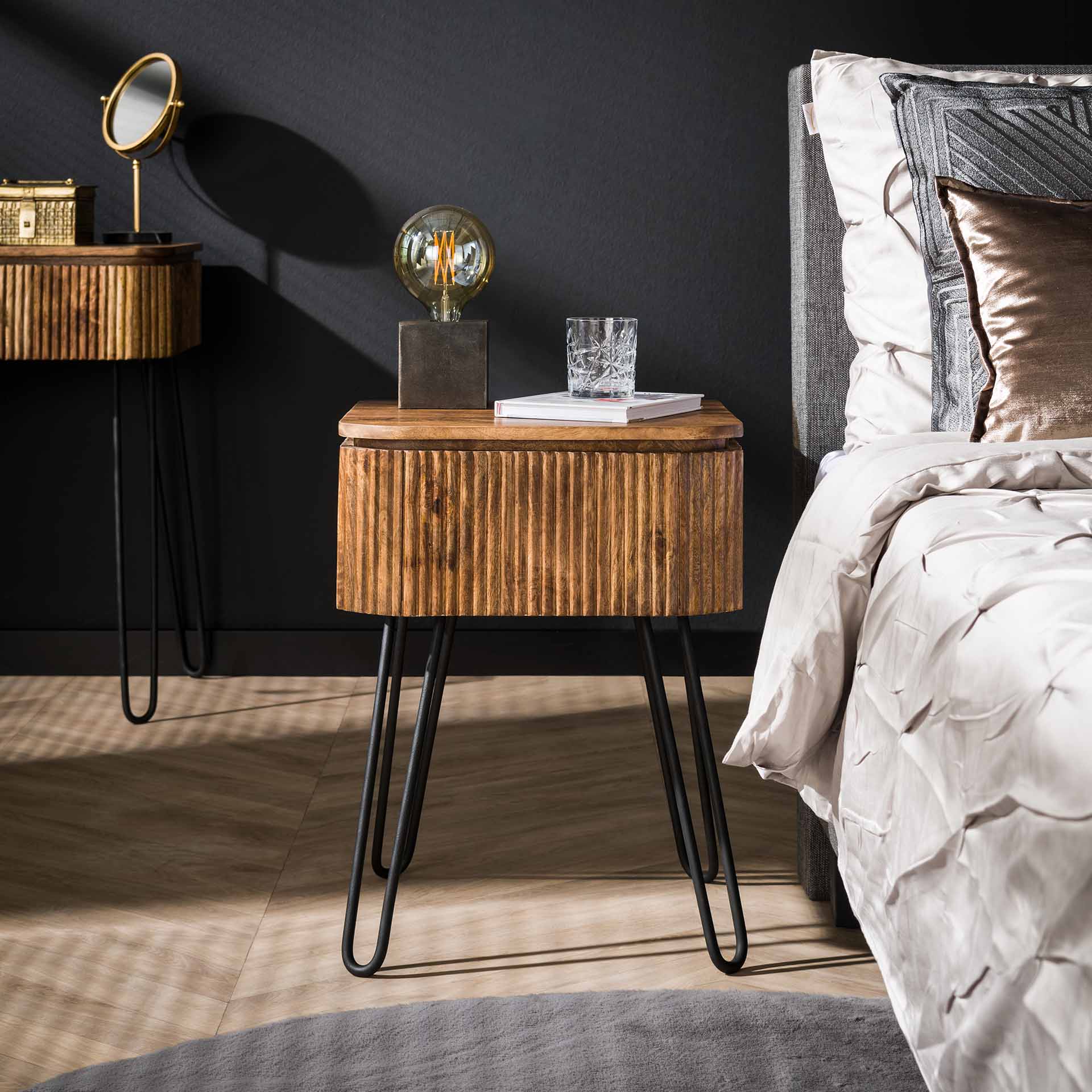 Dit nachtkastje krijgt ook een unieke uitstraling door het prachtige golfontwerp van het hout. Hierdoor krijgt dit nachtkastje een eigentijdse en trendy look. Door het niet standaard zwarte metalen onderstel past dit nachtkastje in bijna ieder interieur.