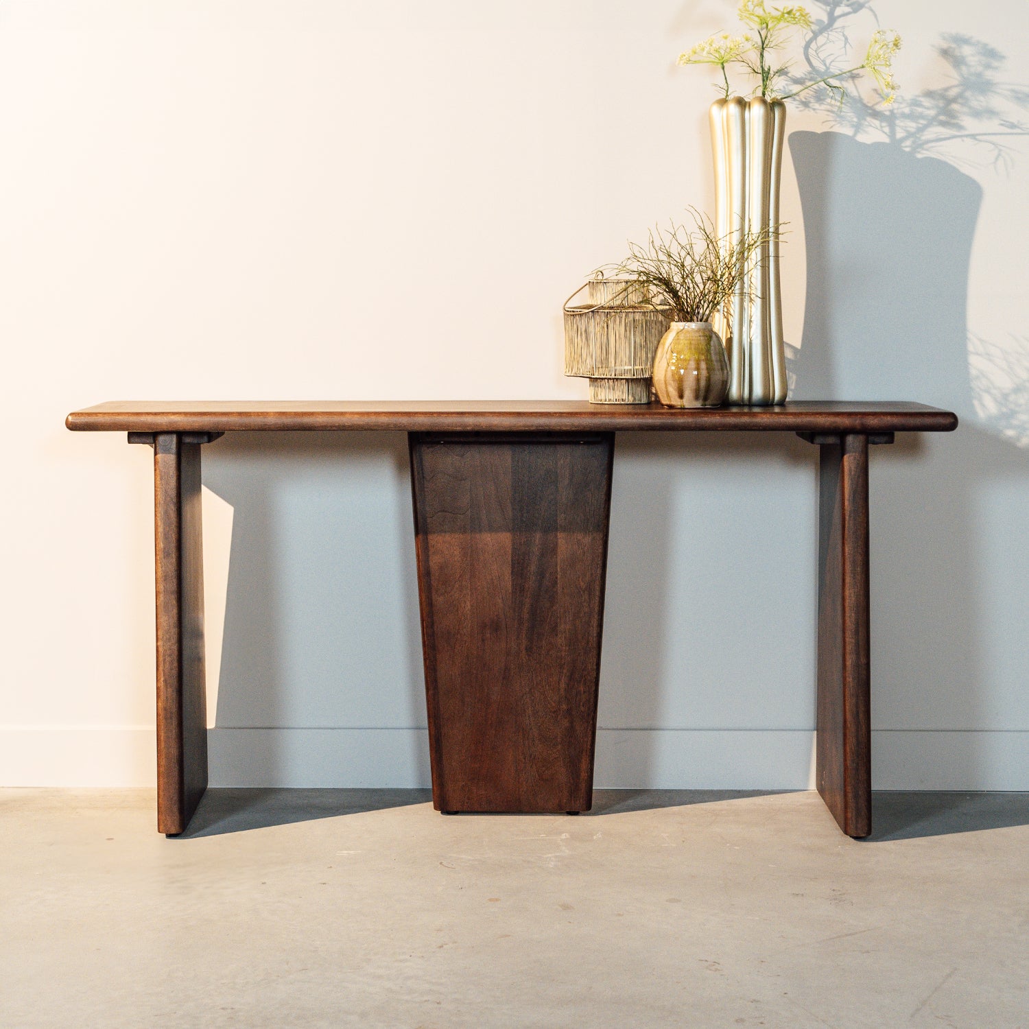 De tafel is ontworpen met een stevig onderstel van acaciahout, wat niet alleen bijdraagt aan de stabiliteit maar ook zorgt voor een uniforme uitstraling die het natuurlijke karakter van het hout benadrukt. De Lagos wandtafel is ideaal om te plaatsen in een gang, woonkamer of zelfs als een elegante toevoeging in een kantoorruimte.