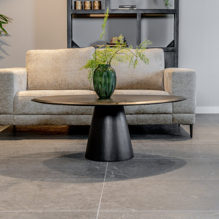 De ovale vorm van de tafel voegt een vleugje elegantie en originaliteit toe aan je woonkamer en creëert een gezellige en harmonieuze sfeer. Het tafelblad biedt voldoende ruimte voor het presenteren van decoratieve items of het neerzetten van drankjes en boeken. De simpele constructie van massief mangohout maakt deze zwarte salontafel veelzijdig en geschikt voor verschillende inrichtingsstijlen.