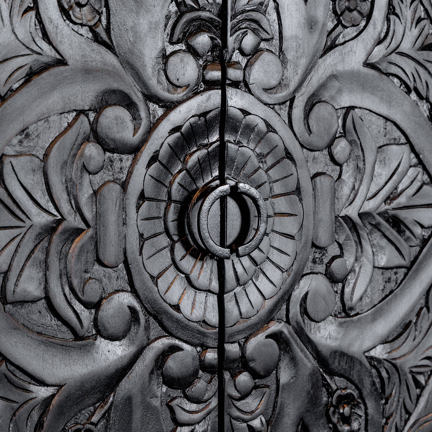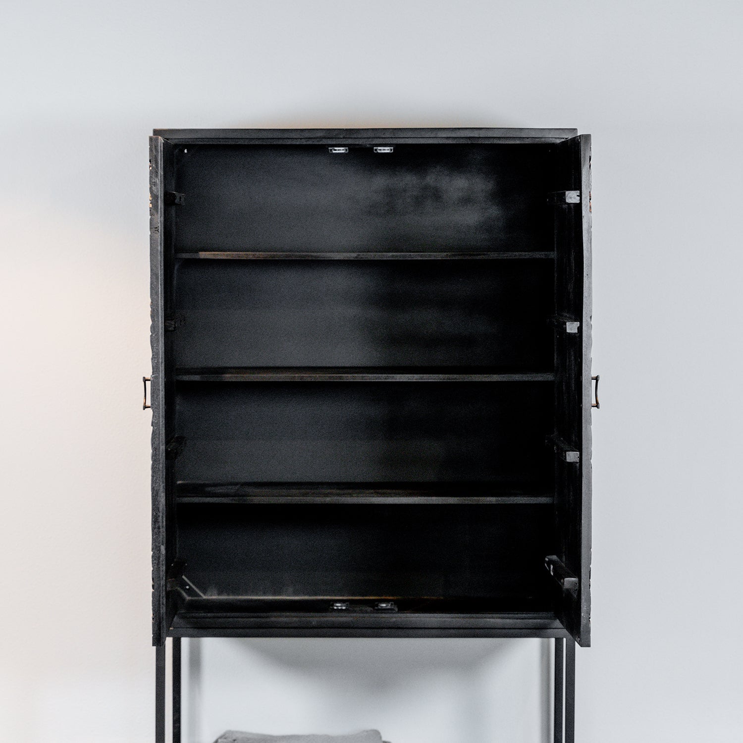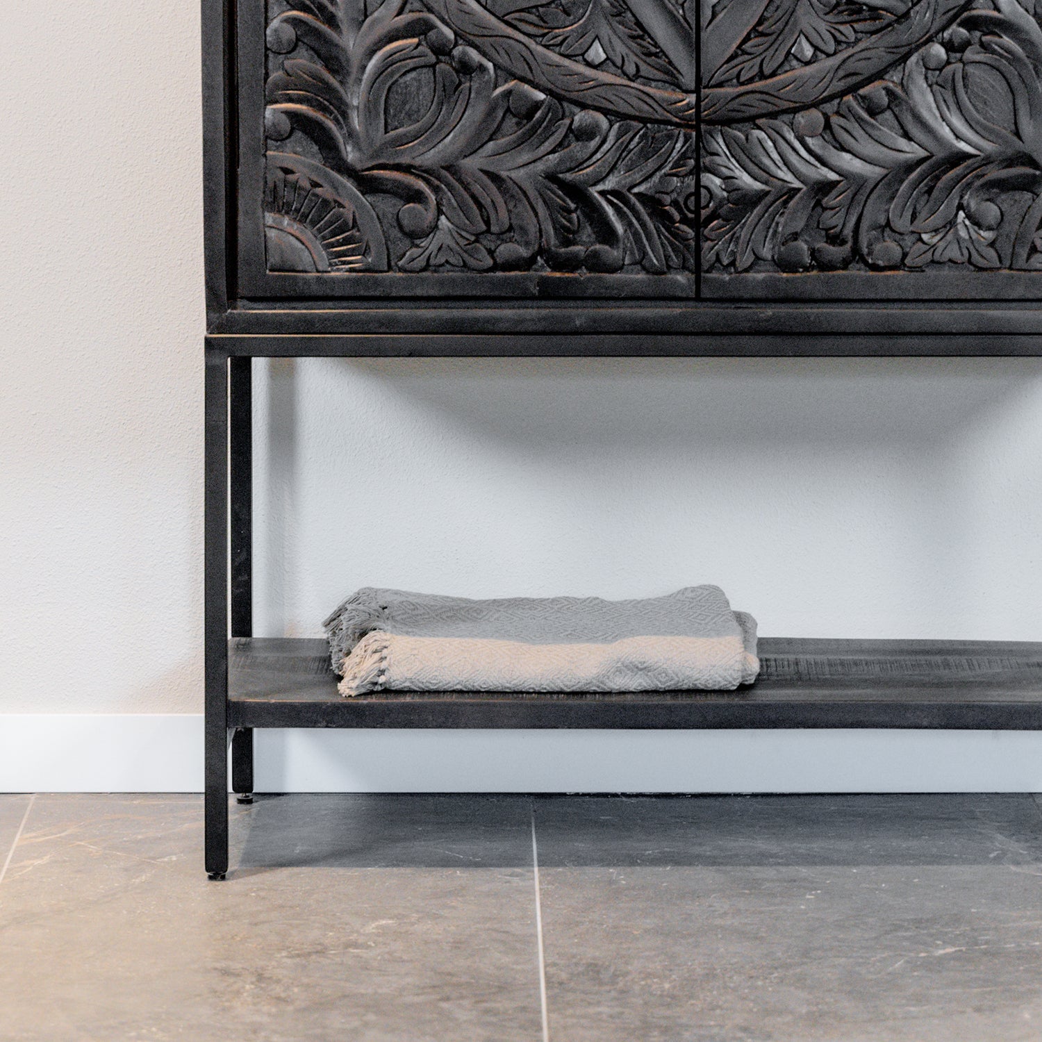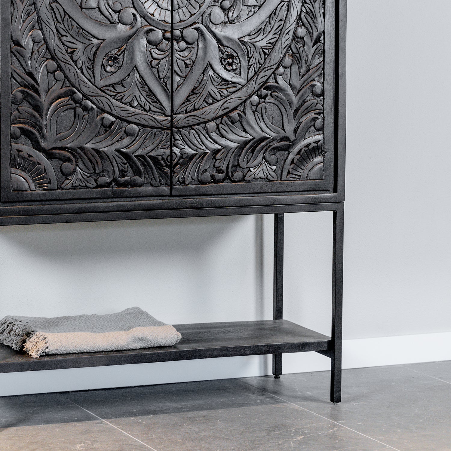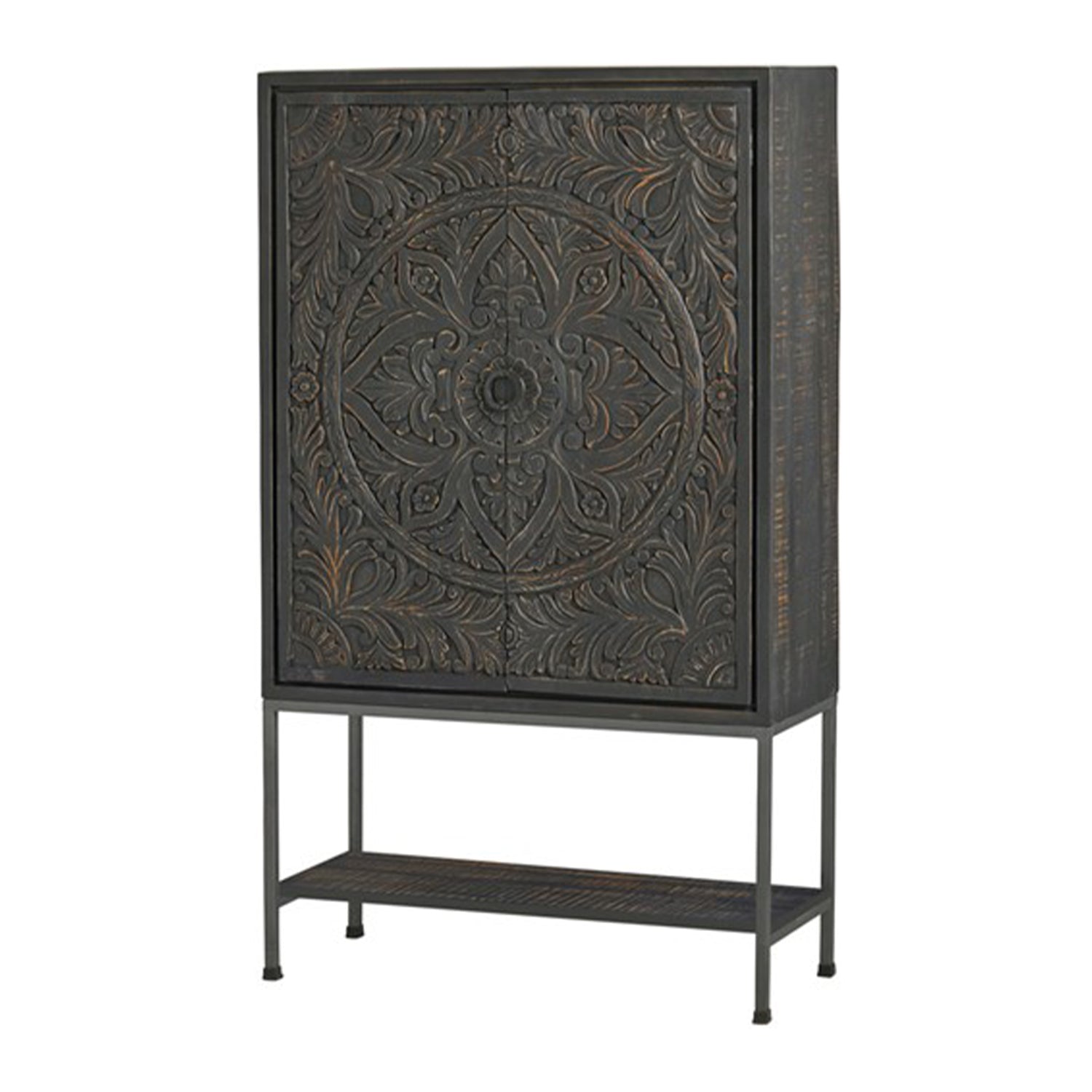 Dit kabinet is gemaakt van massief mangohout, met handgesneden deuren in een elegant zwart antieke afwerking. Het metalen frame is zwart gepoedercoat voor duurzaamheid, en het massieve mangohout is prachtig zwart gelakt.