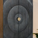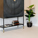 De kast heeft een stevig metalen frame met een zwarte poedercoating, wat niet alleen zorgt voor een moderne uitstraling, maar ook beschermt tegen krassen en slijtage. De accenten zijn gemaakt van messing met een antieke uitstraling, wat een vleugje klasse toevoegt.