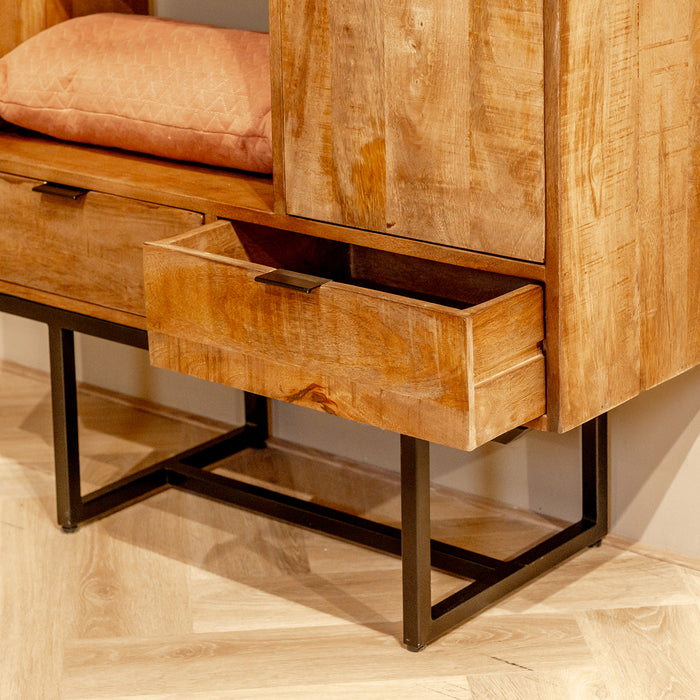 De combinatie van het mangohout en zwart staal geeft dit meubel een chique en industriële uitstraling. Daarnaast heeft de vakkenkast drie deuren en twee lades, een enorme berg opbergruimte dus! Daarnaast kan je er leuke accessoires inzetten, doordat er drie open stukken in zitten. Wees creatief en richt de kast op je eigen manier in!