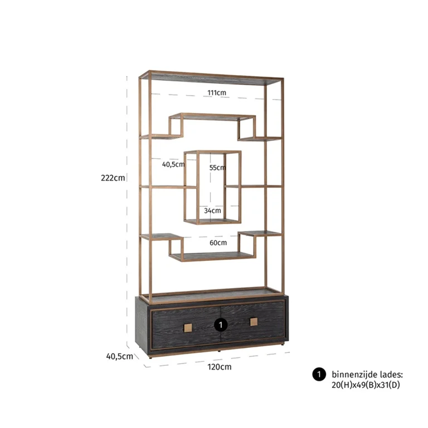 Ben je op zoek naar een kast die perfect past bij je interieur? Dan is Wandkast Hunter een top idee! Hunter is gemaakt van eikenhout en metaal, met twee lades en verder een vakkenkast. Deze kast is zwart met gouden afwerkingen en straalt elegantie uit.