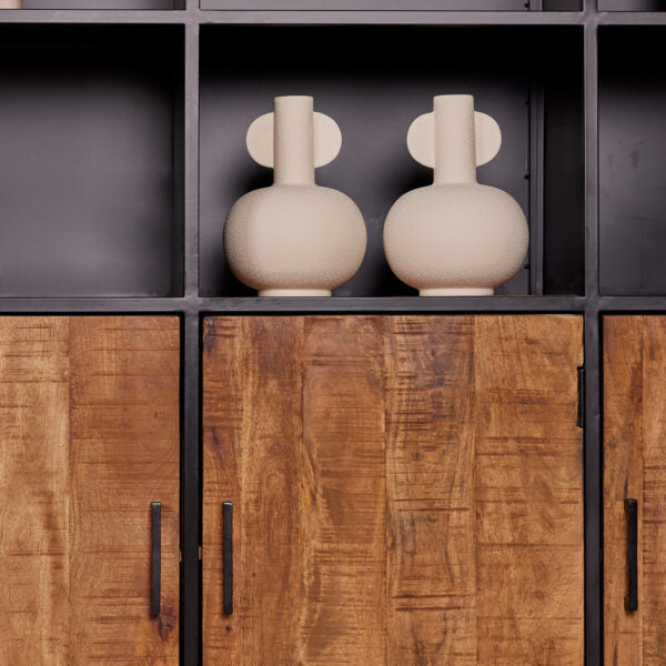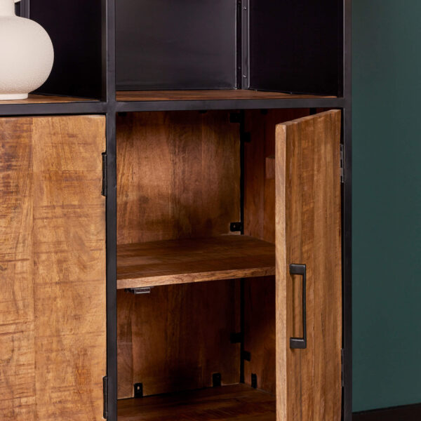 De Oakland Boekenkast heeft mangohouten deuren, stalen legplanken en het frame en de handgreep zijn gemaakt van metaal en afgewerkt met een zeer strakke zwarte lak.