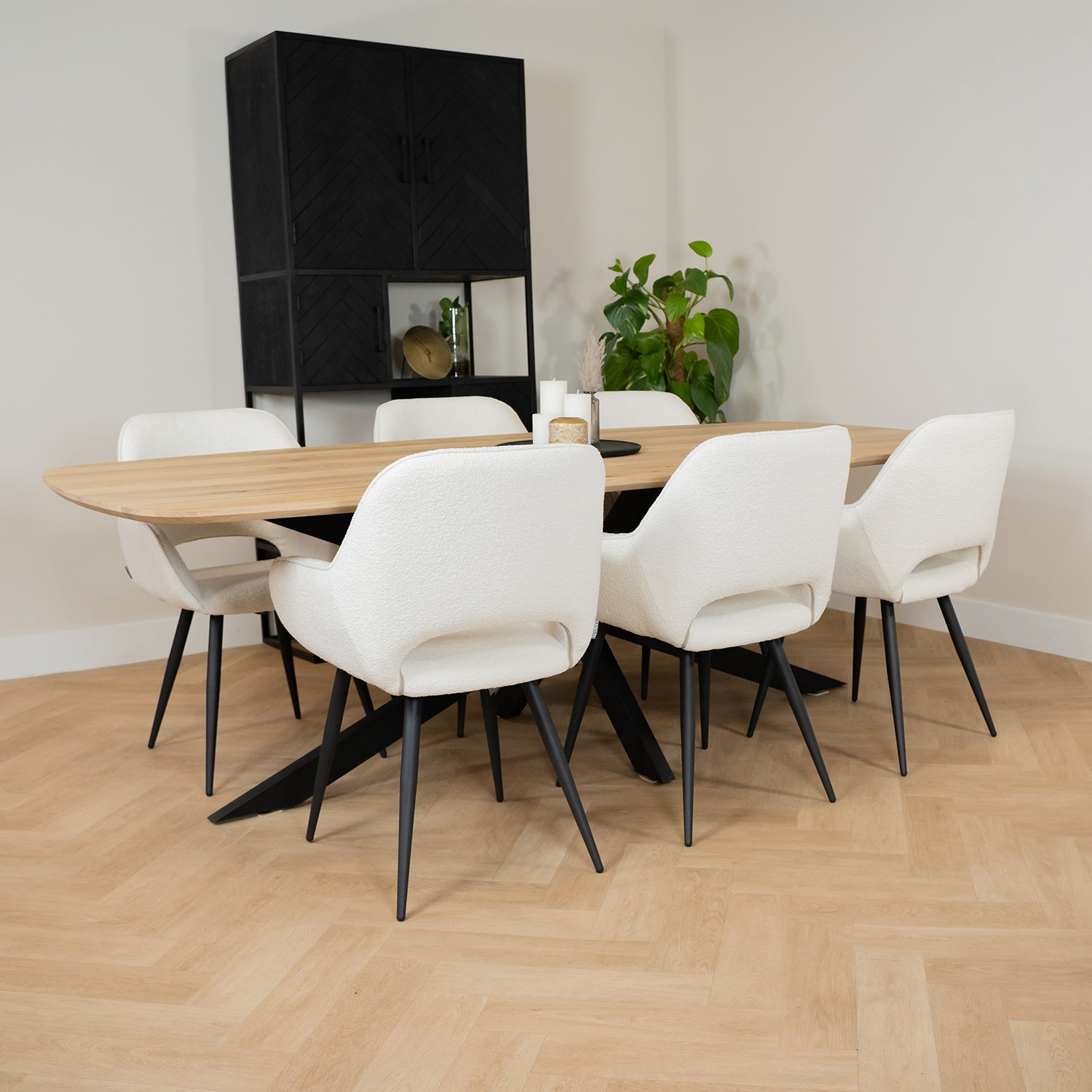 Bouclé Eetkamerstoelen zijn erg stijlvol en helemaal van deze tijd. De lichte tinten en zachte stoffen kan je goed combineren met andere lichte materialen in je woonkamer.