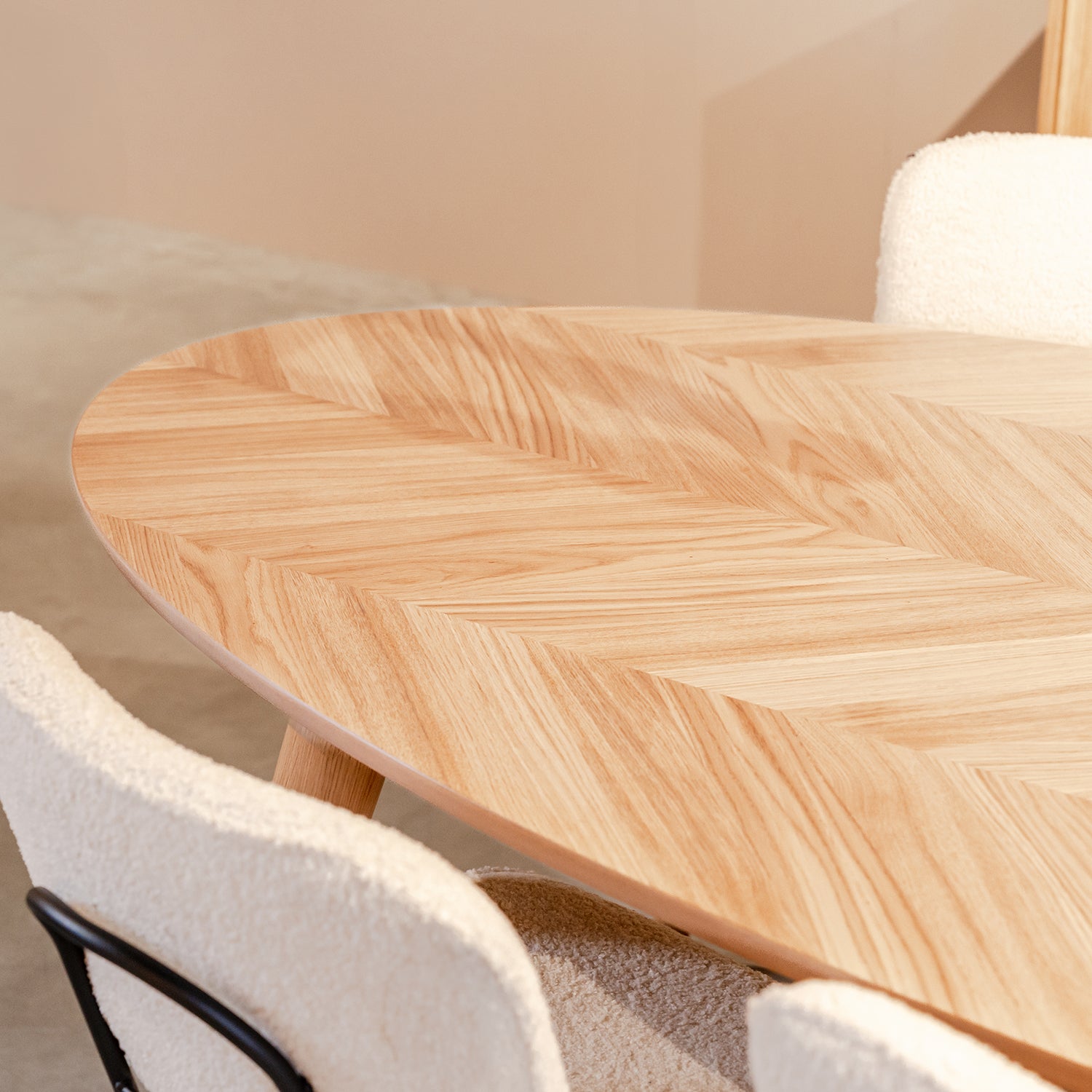 Met zijn unieke vorm en elegante vissengraatpatroon op het blad, is de eiken eettafel een ware eyecatcher. De vier kegelvormige poten, licht naar binnen geplaatst voor een speels accent, zorgen voor een stabiele basis met een modern tintje.