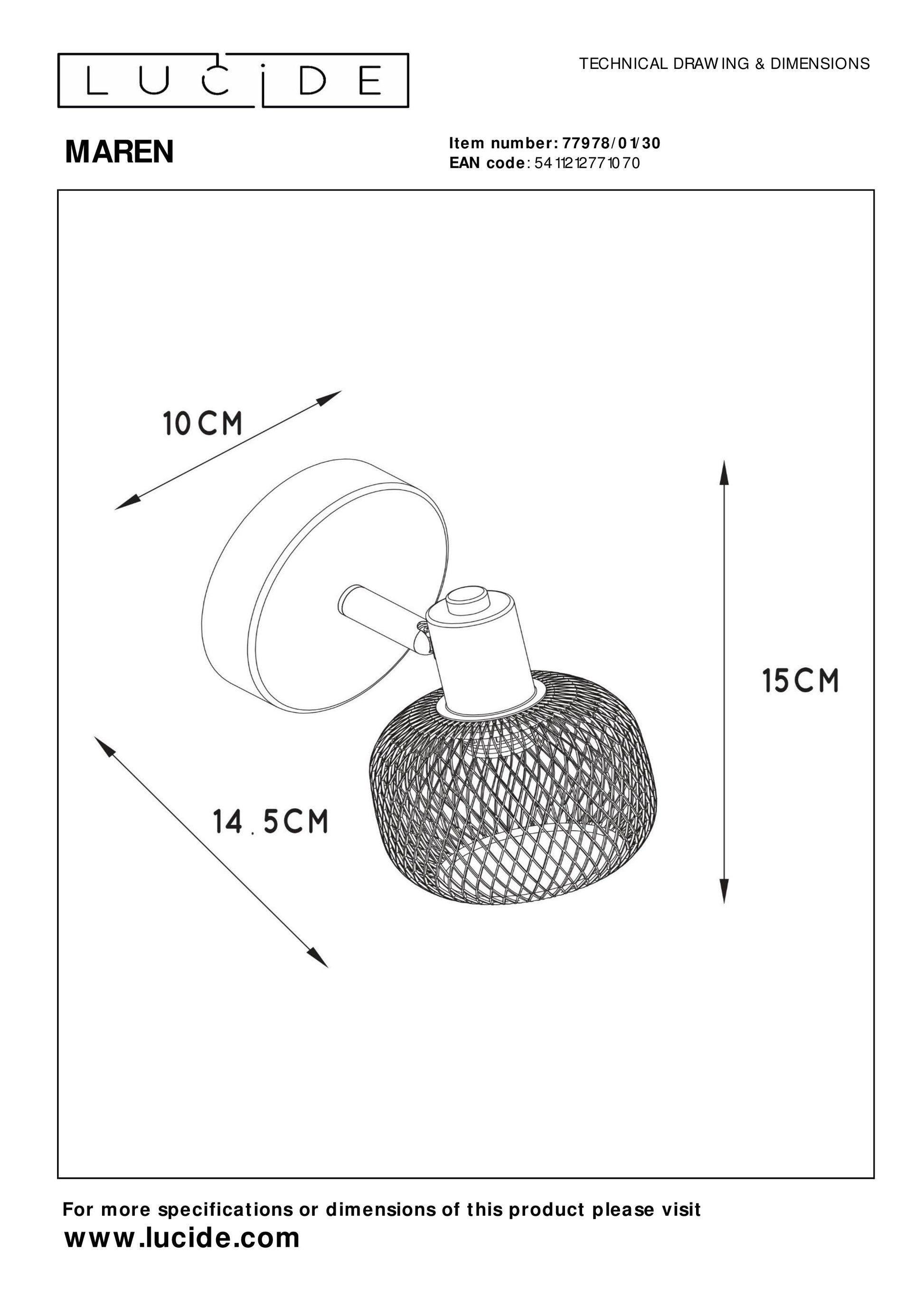 Maak kennis met Maren, de wandspot met haar unieke ontwerp. Deze plafondspot combineert een klassieke basis met een dynamisch metalen rasterwerk, wat resulteert in een verrassend retro accent voor jouw interieur. Hoewel de lamp compact van formaat is, straalt ze groots met haar licht dat door het bolvormige raster wordt verspreid. Met deze zwarte plafondlamp geniet je van maximale flexibiliteit, dankzij haar draai- en kantelbaarheid, waardoor je moeiteloos aan al je verlichtingsbehoeften kunt voldoen.