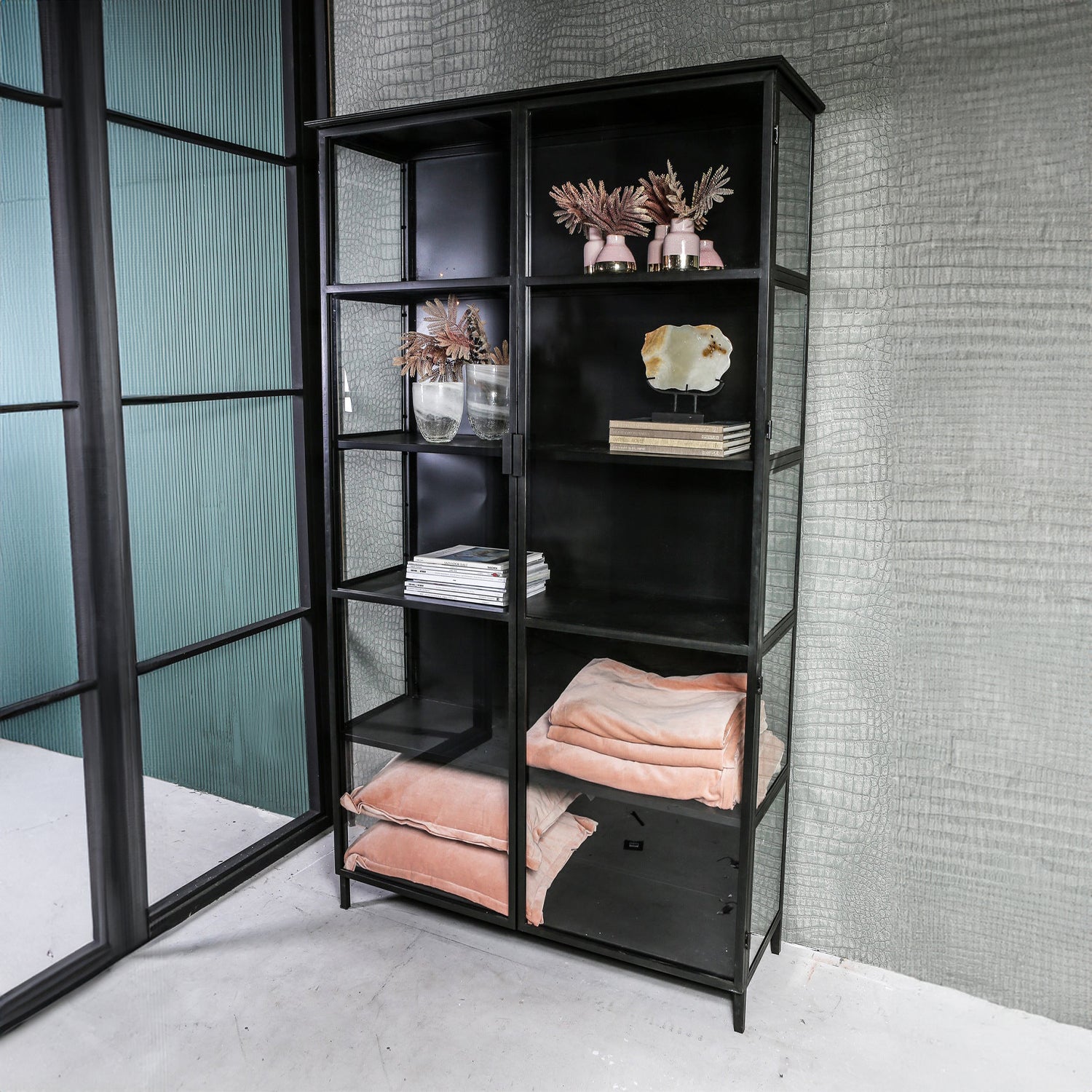 Gemaakt van zwart staal, biedt deze vitrinekast niet alleen een stevige constructie, maar ook een eigentijdse uitstraling. Het is een stijlvolle keuze voor elk interieur, zowel praktisch als decoratief.