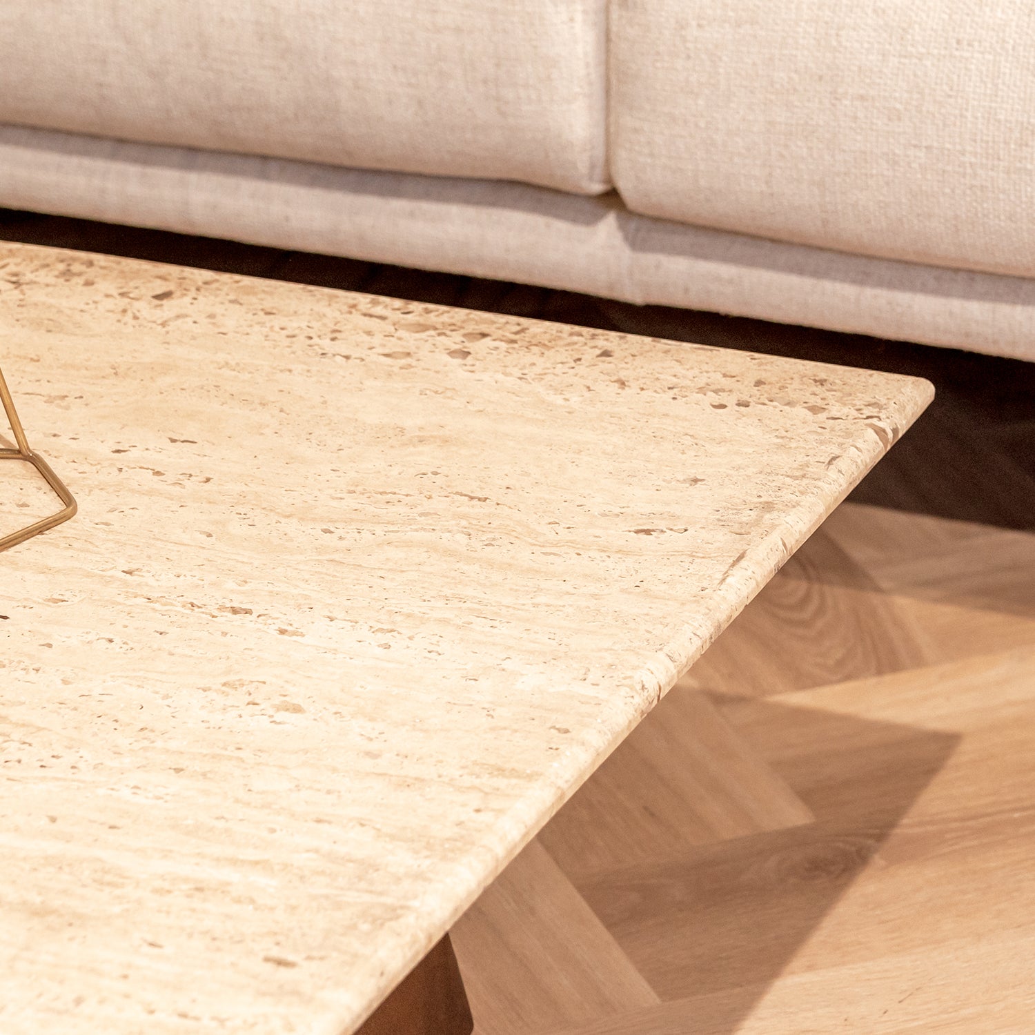 Salontafel Valentino is een stoere salontafel uitgevoerd in mangohout en een tafelblad van Travertin. Het meubel combineert de warmte van natuurlijk mangohout met de geliktheid van natuursteen Travertin. Al met al een strak design.