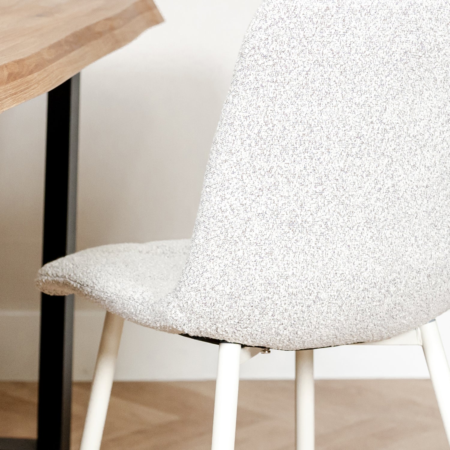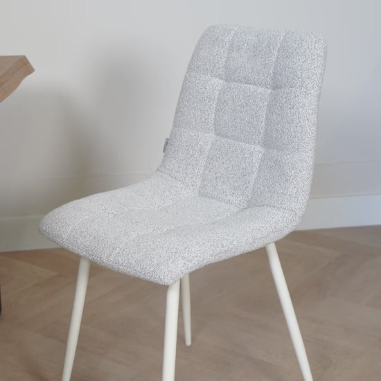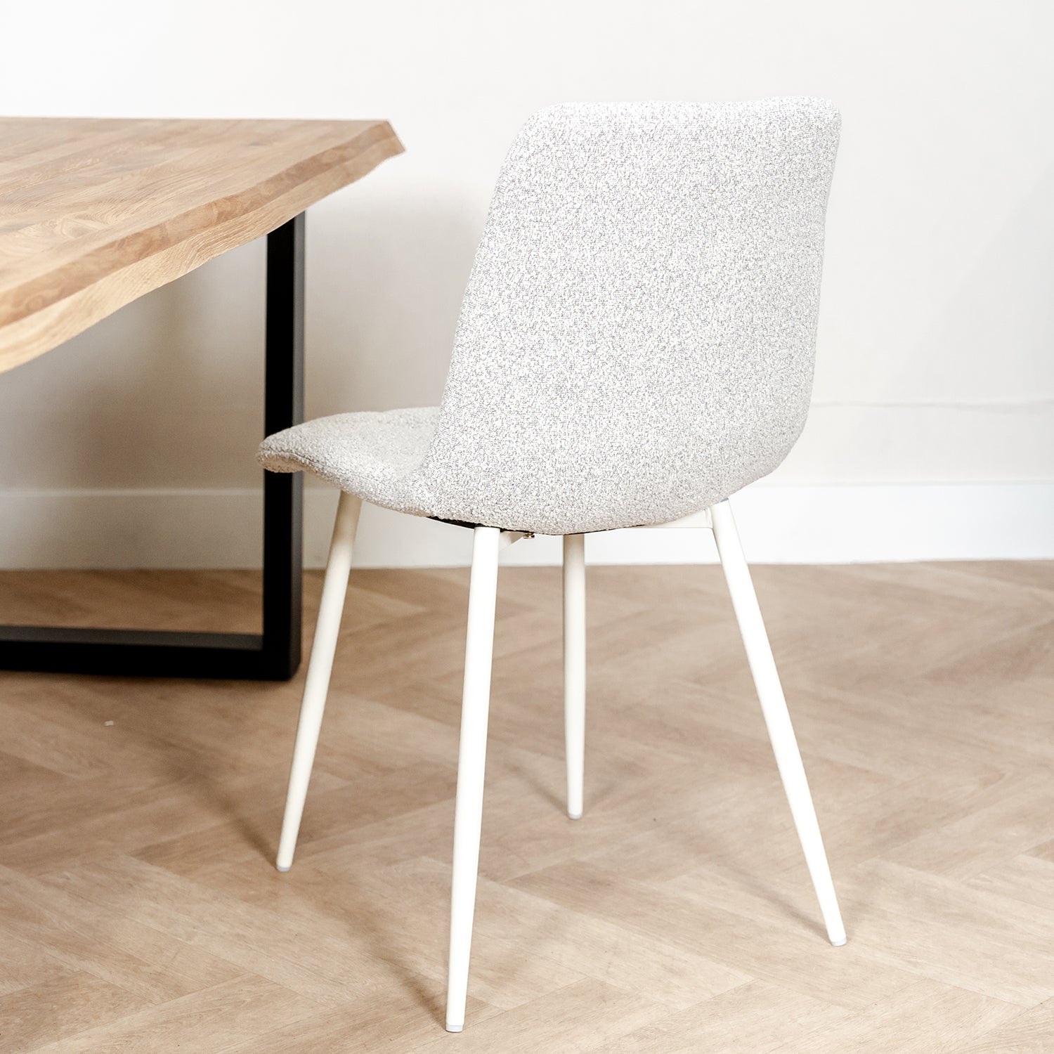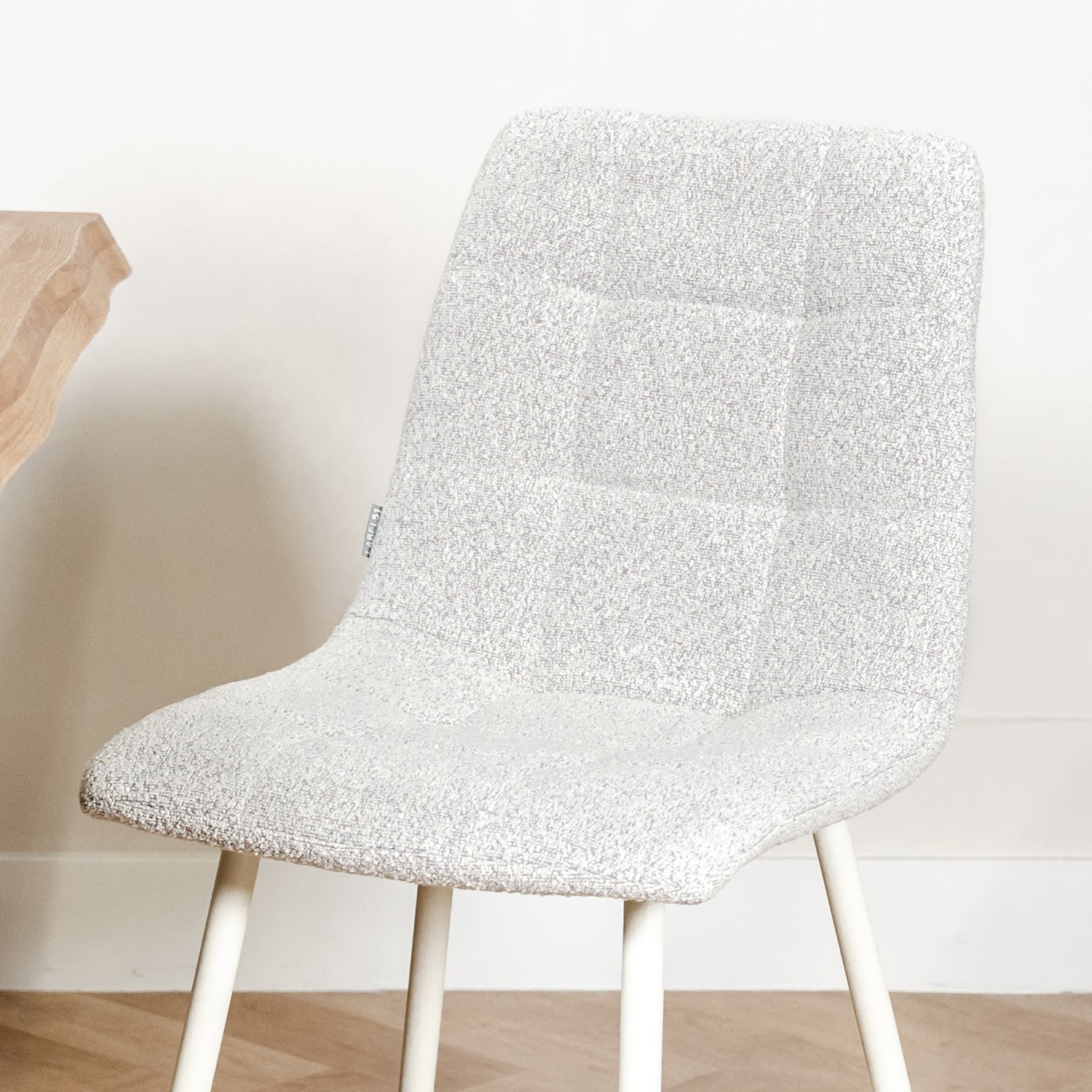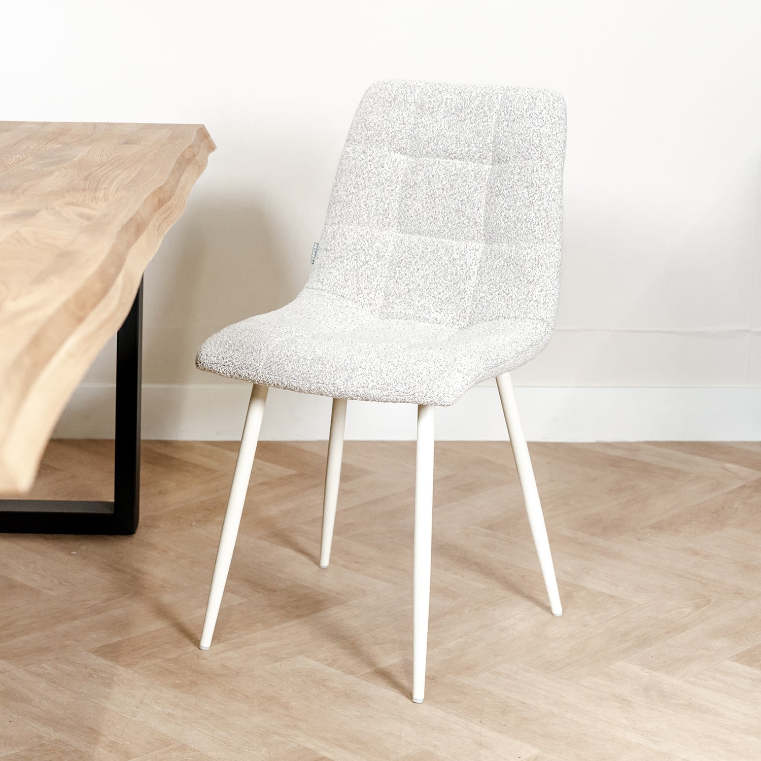 Eetkamerstoel Nino is een prachtige trendy stoel, verkrijgbaar in verschillende kleuren in de stof Bouclé. De moderne eetkamerstoel heeft een vierkant gevormde zitting met elegante rondingen. De rugleuning en zitting hebben een zogenoemd 'gecapitonneerd stiksel' waardoor het 3D effect van het zachte foam wordt geaccentueerd. Dat zit lekker zacht!