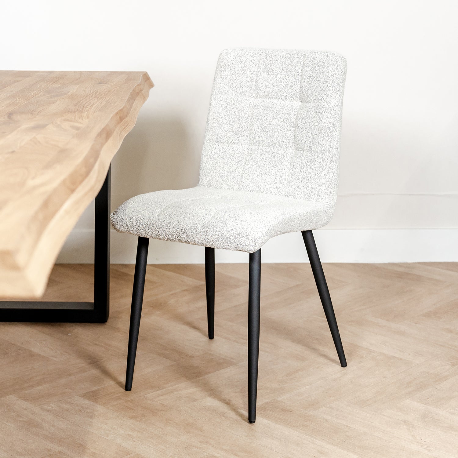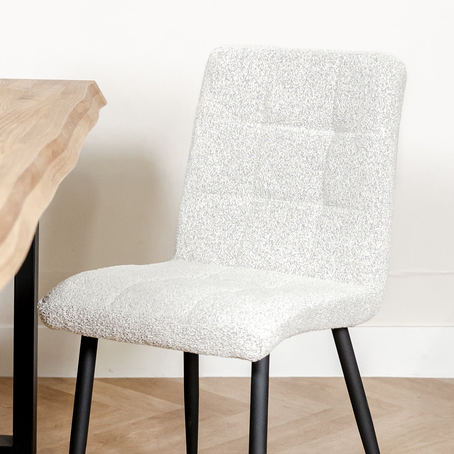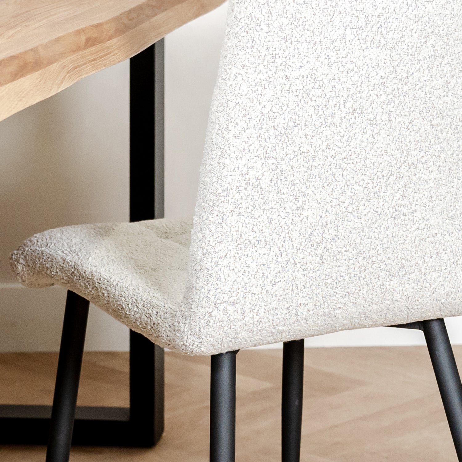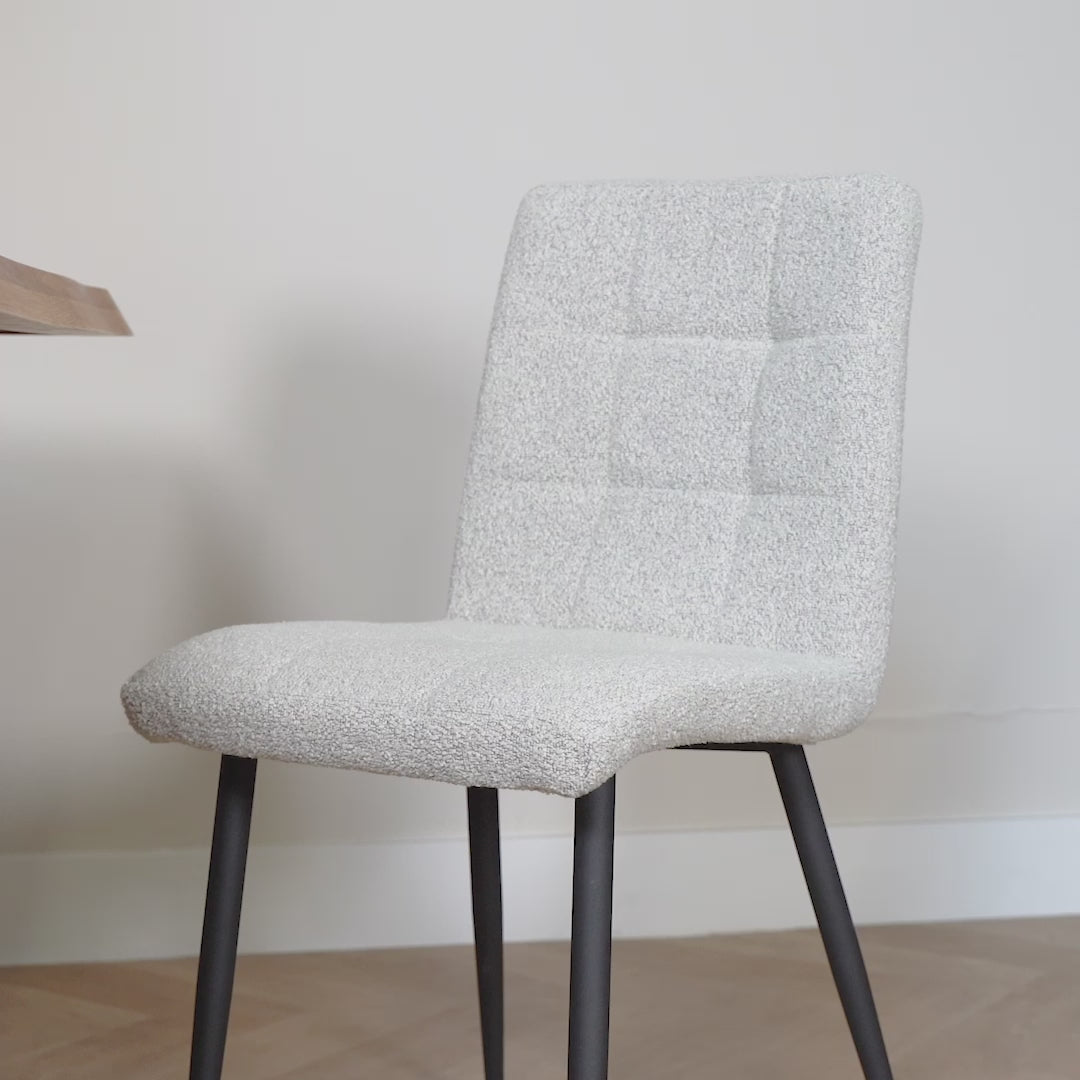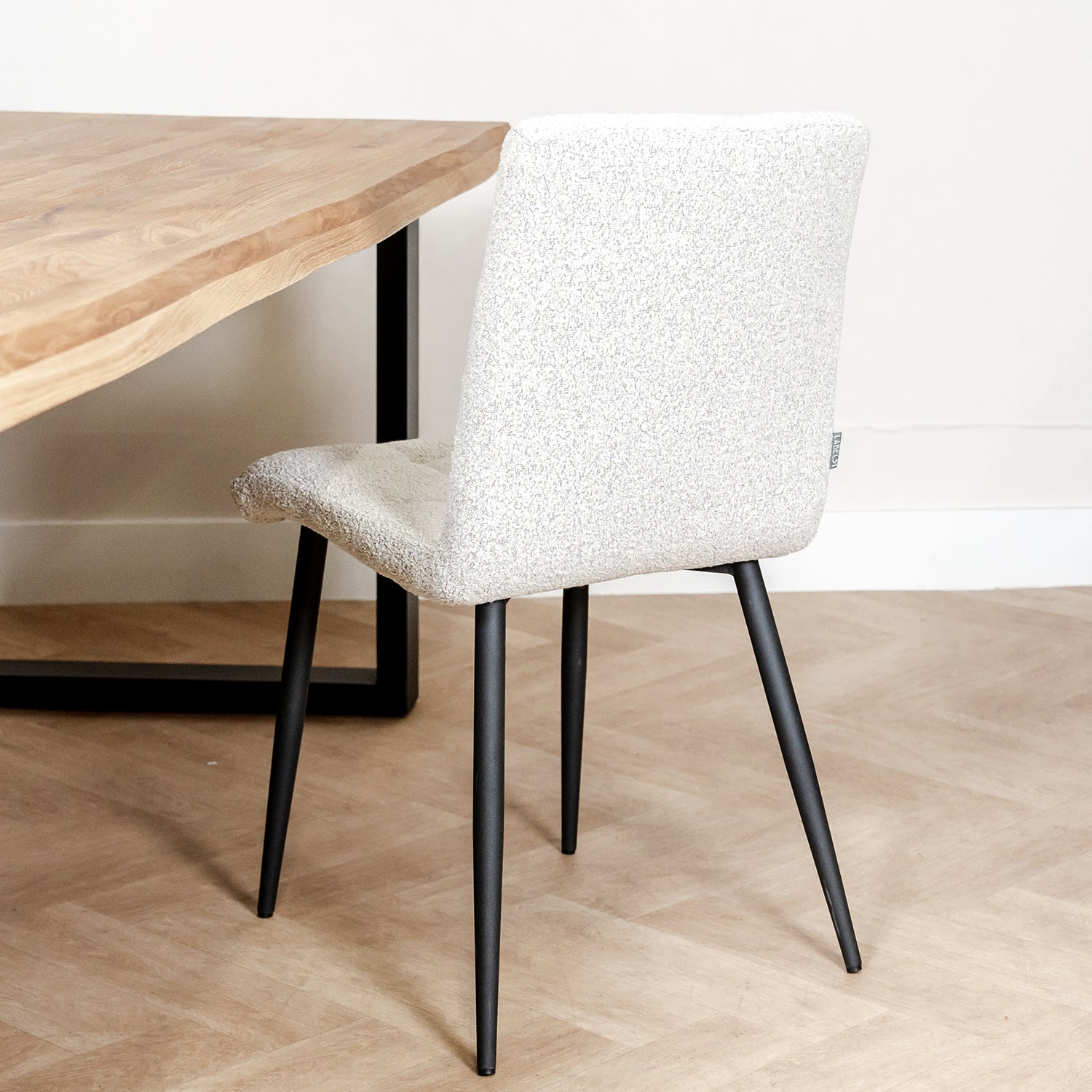Door zijn vormen en materialen past Sam in ieder trendy interieur. Heb je nou een Modern interieur, Scandinavisch interieur of Industrieel interieur? Eetkamerstoel Sam in de stof Bouclé is mega geschikt om mee te variëren en combineren. Denk aan een fijne stoel voor aan jouw bureau of kaptafel. Natuurlijk is deze betaalbare eetkamerstoel ook leuk als set aan de eetkamertafel te plaatsen. Door zijn lichte gewicht en compacte formaat is Sam ook de ideale stoel voor aan een kleine eettafel. Voor ieder wat wils.