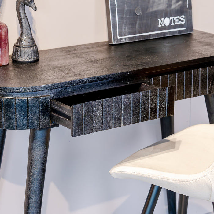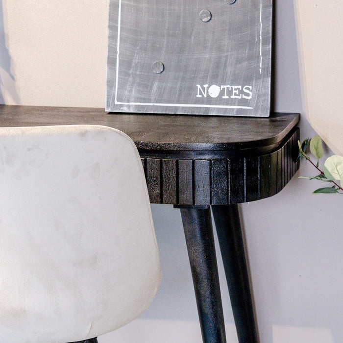 Maak kennis met Bureau Nils. Dit bureau, met zijn blad van zwart mangohout en afgeronde hoeken, heeft twee ruime lades om al je spullen netjes op te bergen. De ronde, schuin aflopende poten geven het bureau een luchtige touch en laten het echt tot leven komen. Het trendy design en speelse uitstraling maken werken en studeren een stuk leuker.