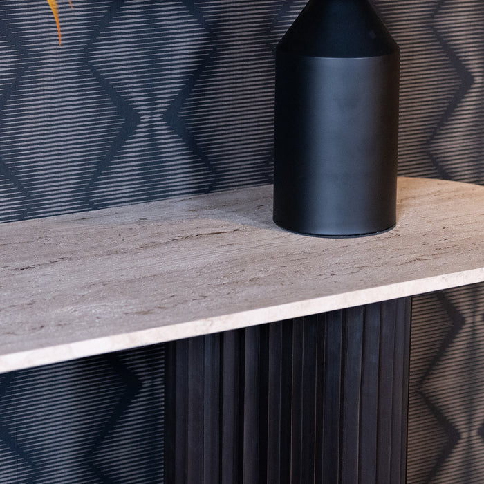De travertin sidetable past goed bij verschillende interieurstijlen, van modern tot klassiek en meer. Het travertin zorgt voor stabiliteit en stevigheid, waardoor je erop kunt vertrouwen dat deze tafel lang meegaat.